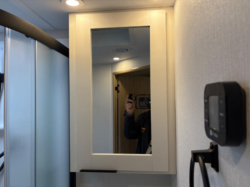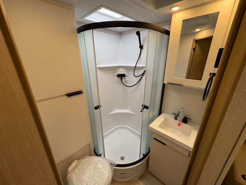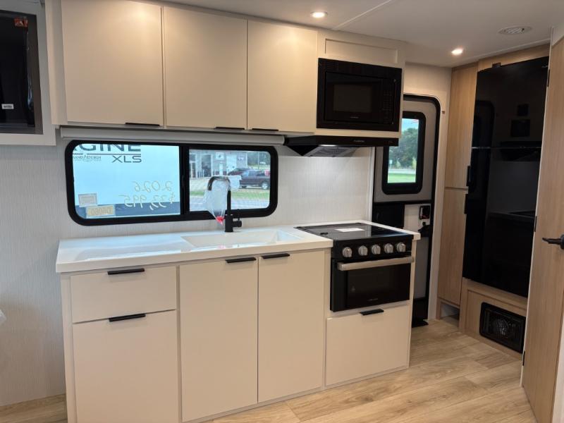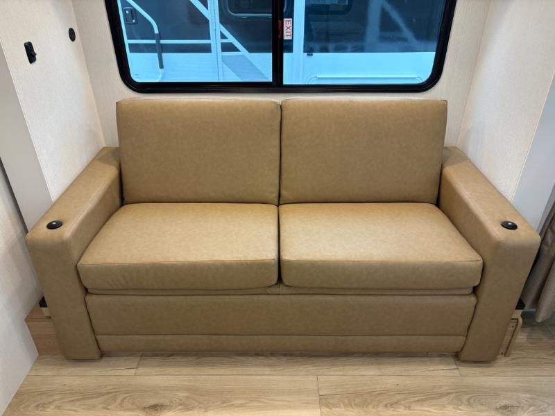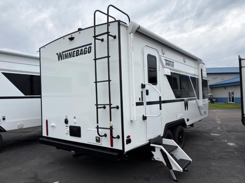 With any Thrive travel trailer by Winnebago, you can camp with functionality, comfort, and convenience! The large front viewing window will be the first thing that catches your eye, and the fiberglass sidewalls with Azdel Onboard provide a durable trailer made to last. There is also an exterior ladder, along with front radius profile lights, power stabilizer jacks, and a powered awning with LED lighting to name a few exterior features. You will stay powered up by the 30-amp power cord and 200-watt solar panel, plus there is a tankless water heater for endless hot showers. Inside, you'll love the custom Winnebago furniture, carpetless side outs, molded fiberglass countertops, and residential recessed ceiling lights to keep your space well lit!