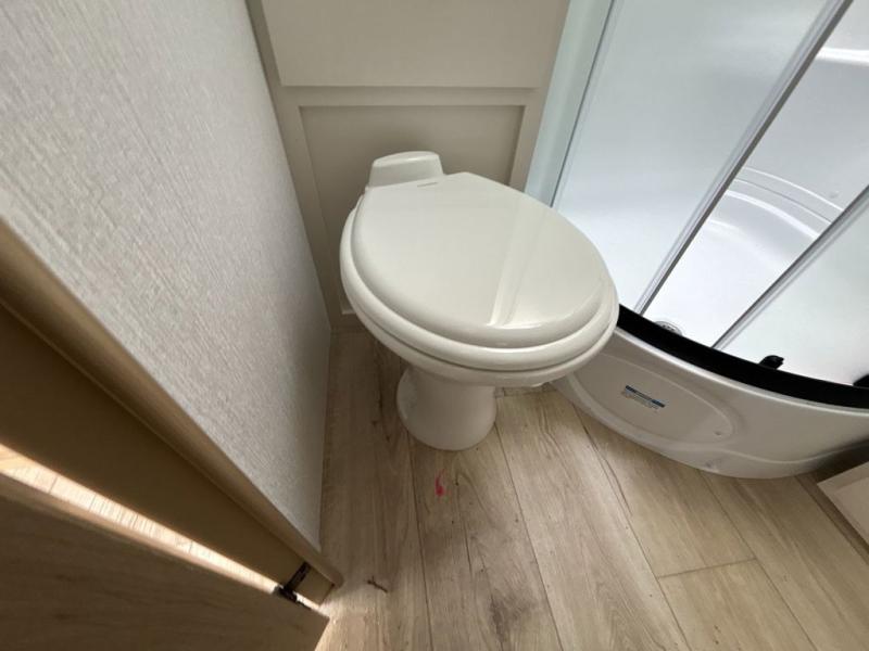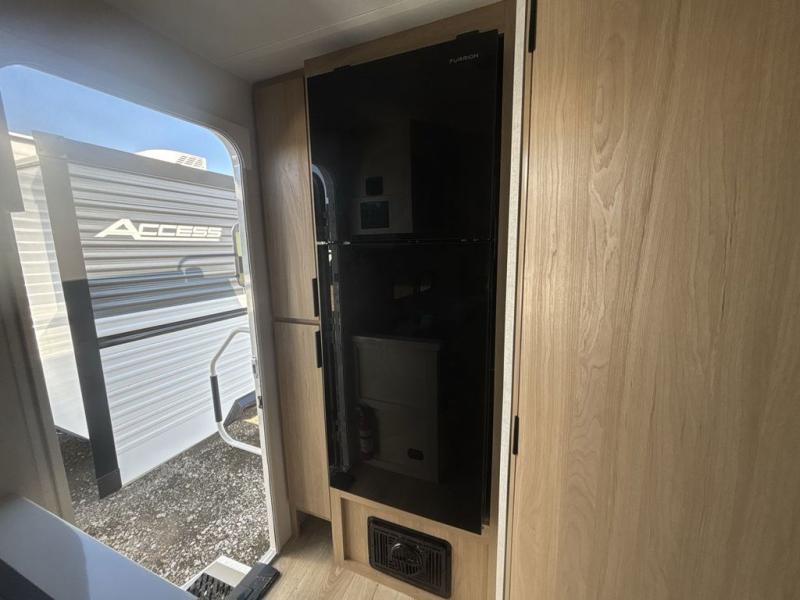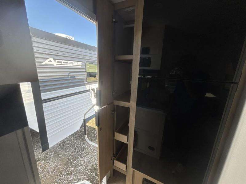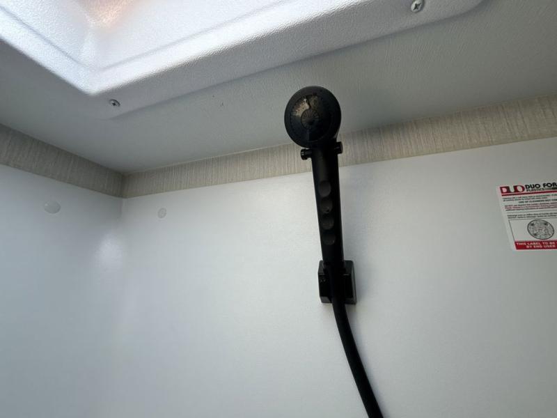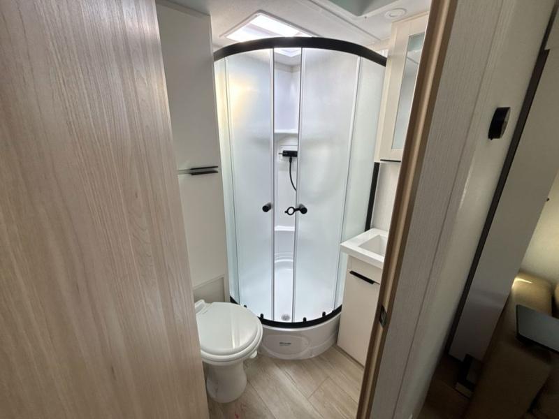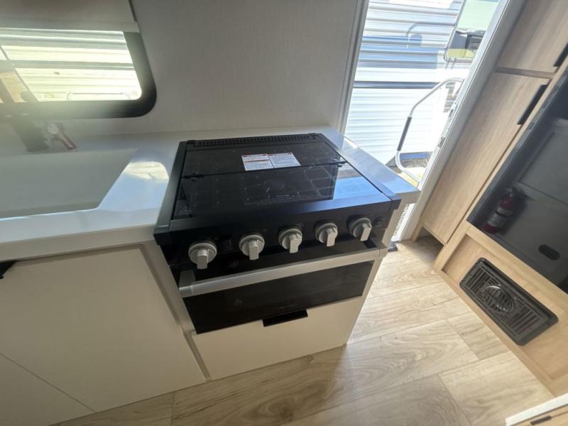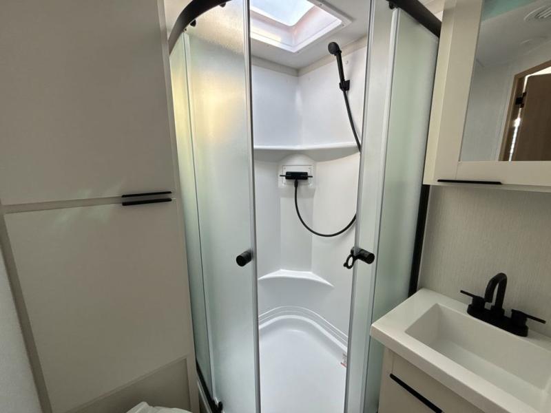 It will be so easy to enjoy camping trips in this compact travel trailer. The jack knife sofa slide provides more floor space plus a place for an overnight guest to sleep. You'll find an Olympic queen bed up front with a privacy curtain and dual bedroom wardrobes to keep your things tidy. A recessed three burner cooktop with an oven will let you make meals each day, and the 10.6 cu. ft. 12V refrigerator will keep your cold items fresh. There is also a pantry with pull-out shelves for added storage space. The full bath includes a power vent fan and a shower skylight that will give you more lighting and extra head room as you get ready each day!