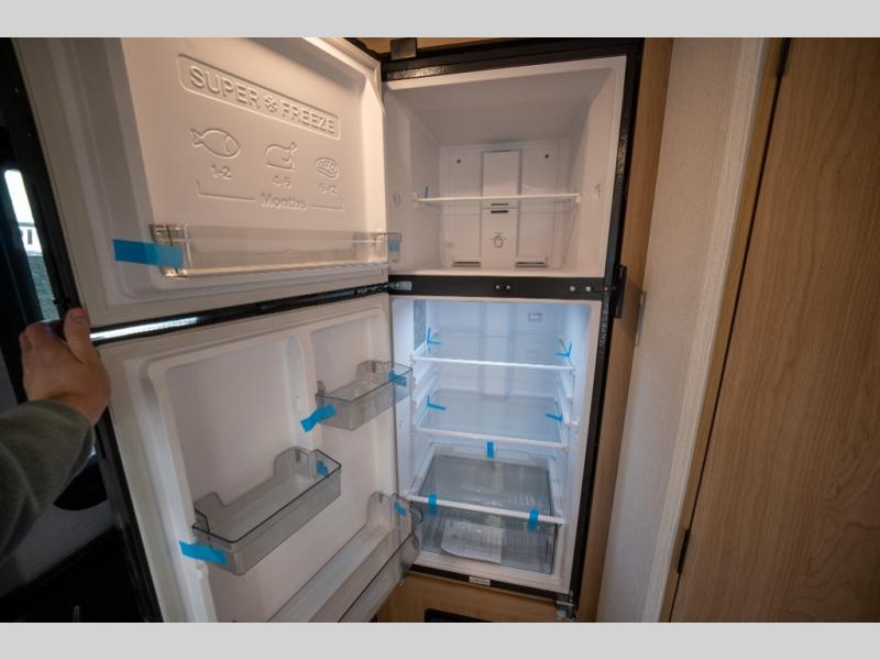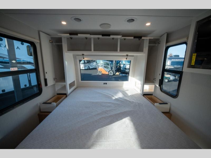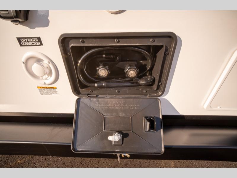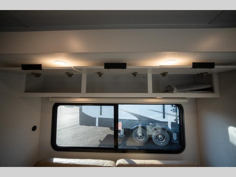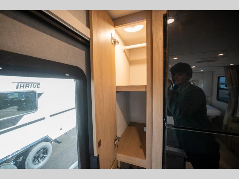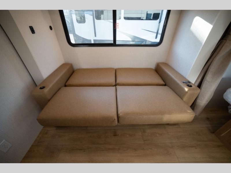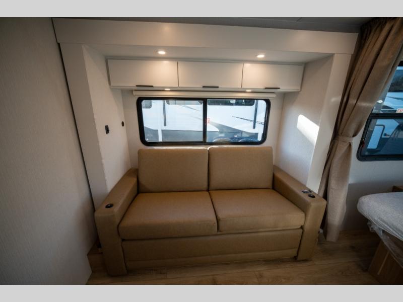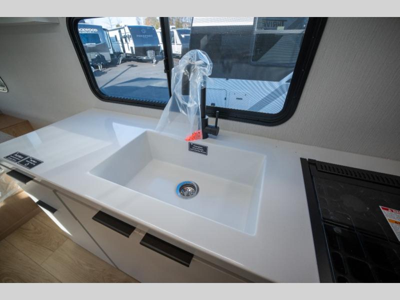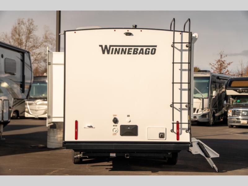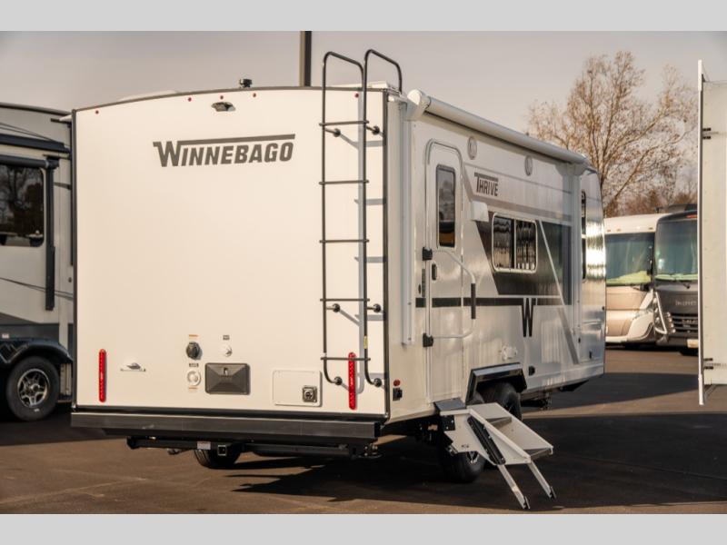 With any Thrive travel trailer by Winnebago, you can camp with functionality, comfort, and convenience! The large front viewing window will be the first thing that catches your eye, and the fiberglass sidewalls with Azdel Onboard provide a durable trailer made to last. There is also an exterior ladder, along with front radius profile lights, power stabilizer jacks, and a powered awning with LED lighting to name a few exterior features. You will stay powered up by the 30-amp power cord and 200-watt solar panel, plus there is a tankless water heater for endless hot showers. Inside, you'll love the custom Winnebago furniture, carpetless side outs, molded fiberglass countertops, and residential recessed ceiling lights to keep your space well lit!