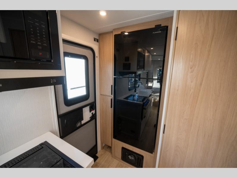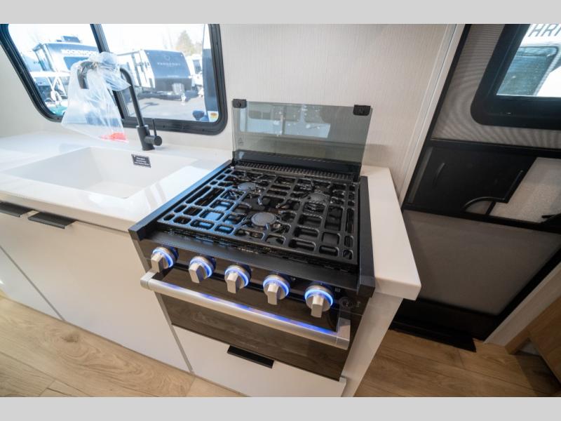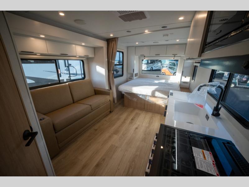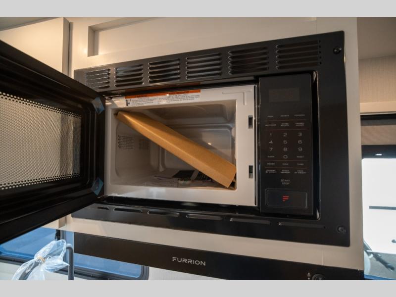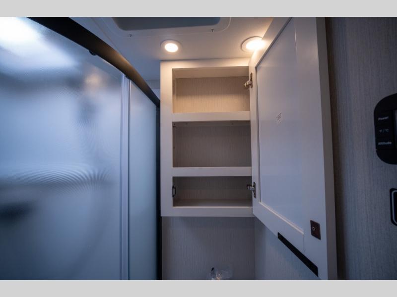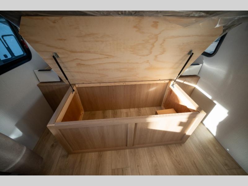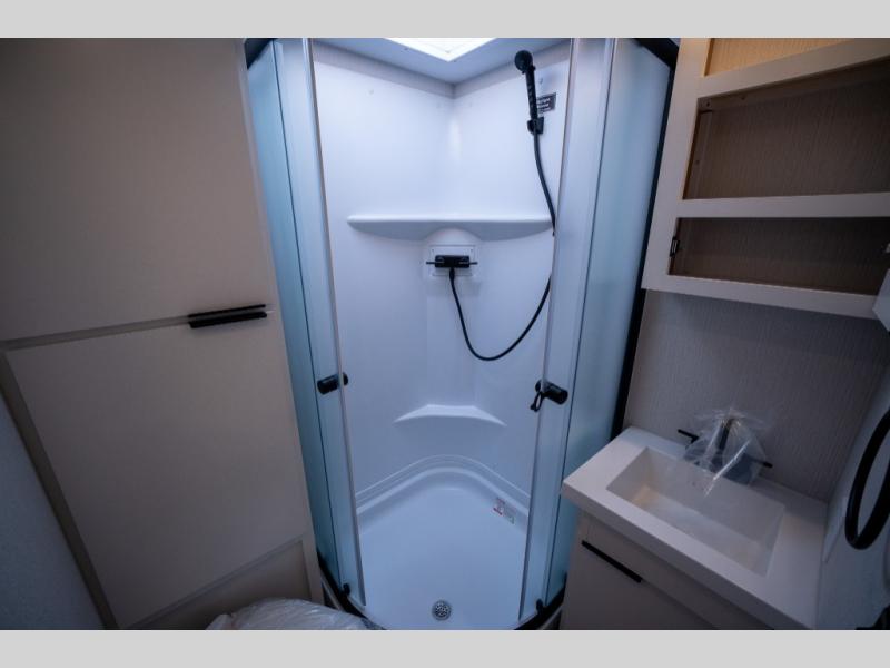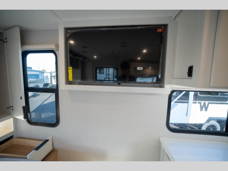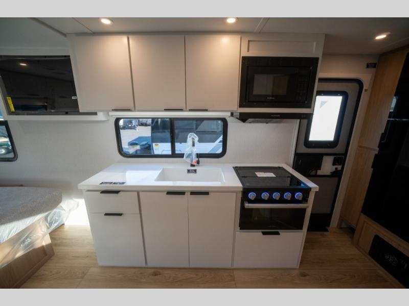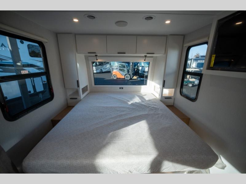 With any Thrive travel trailer by Winnebago, you can camp with functionality, comfort, and convenience! The large front viewing window will be the first thing that catches your eye, and the fiberglass sidewalls with Azdel Onboard provide a durable trailer made to last. There is also an exterior ladder, along with front radius profile lights, power stabilizer jacks, and a powered awning with LED lighting to name a few exterior features. You will stay powered up by the 30-amp power cord and 200-watt solar panel, plus there is a tankless water heater for endless hot showers. Inside, you'll love the custom Winnebago furniture, carpetless side outs, molded fiberglass countertops, and residential recessed ceiling lights to keep your space well lit!