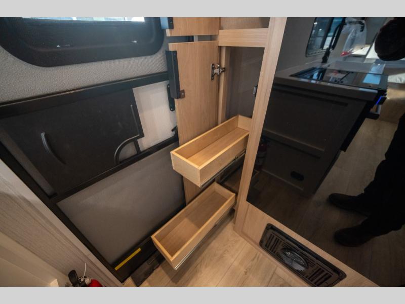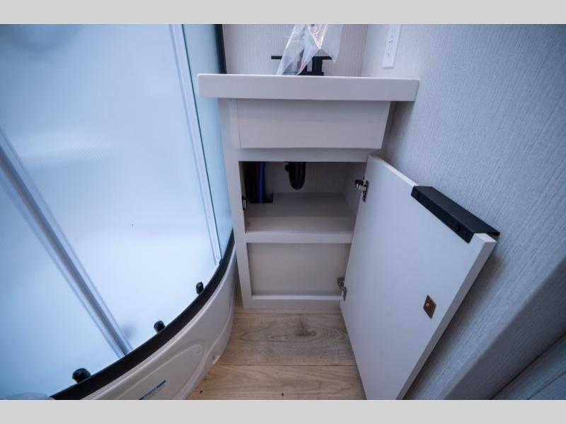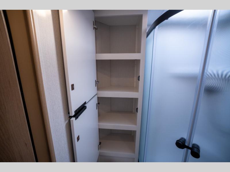It will be so easy to enjoy camping trips in this compact travel trailer. The jack knife sofa slide provides more floor space plus a place for an overnight guest to sleep. You'll find an Olympic queen bed up front with a privacy curtain and dual bedroom wardrobes to keep your things tidy. A recessed three burner cooktop with an oven will let you make meals each day, and the 10.6 cu. ft. 12V refrigerator will keep your cold items fresh. There is also a pantry with pull-out shelves for added storage space. The full bath includes a power vent fan and a shower skylight that will give you more lighting and extra head room as you get ready each day!