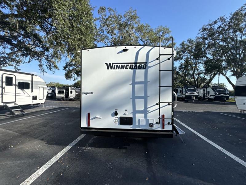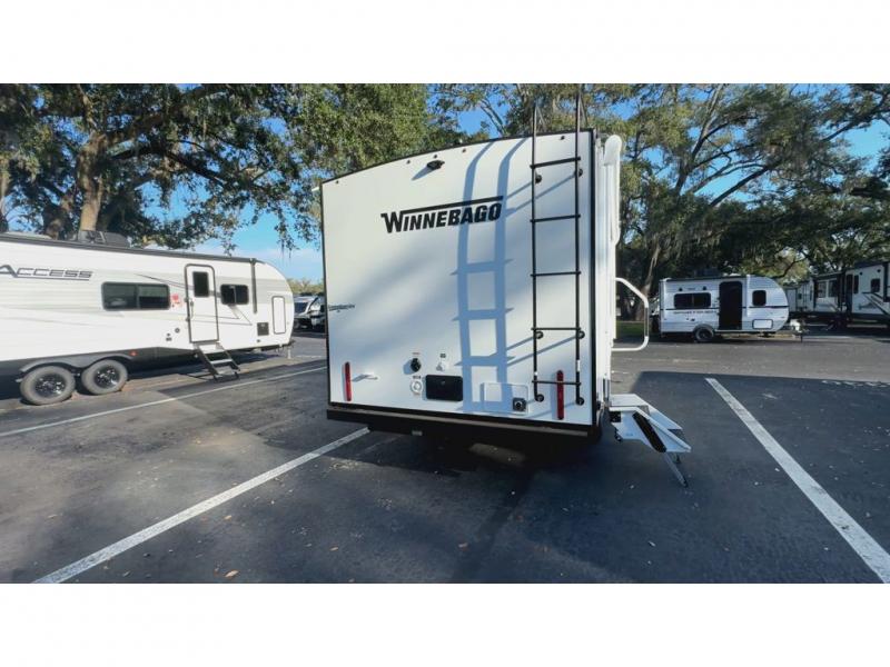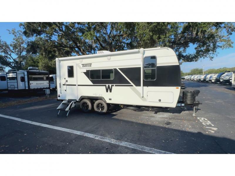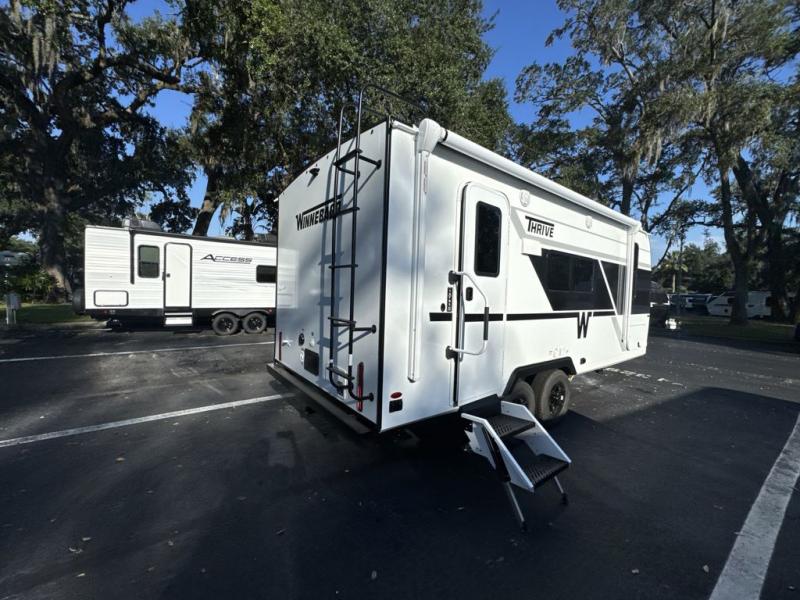 With any Thrive travel trailer by Winnebago, you can camp with functionality, comfort, and convenience! The large front viewing window will be the first thing that catches your eye, and the fiberglass sidewalls with Azdel Onboard provide a durable trailer made to last. There is also an exterior ladder, along with front radius profile lights, power stabilizer jacks, and a powered awning with LED lighting to name a few exterior features. You will stay powered up by the 30-amp power cord and 200-watt solar panel, plus there is a tankless water heater for endless hot showers. Inside, you'll love the custom Winnebago furniture, carpetless side outs, molded fiberglass countertops, and residential recessed ceiling lights to keep your space well lit!