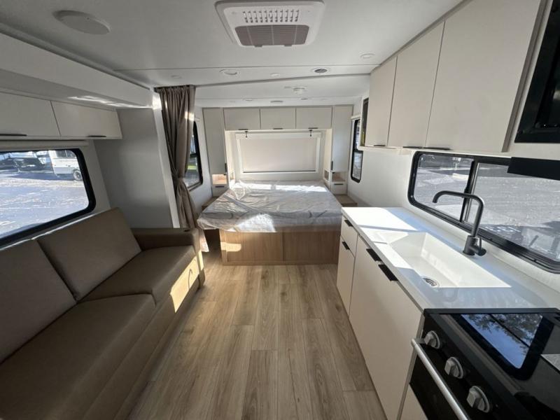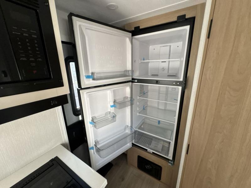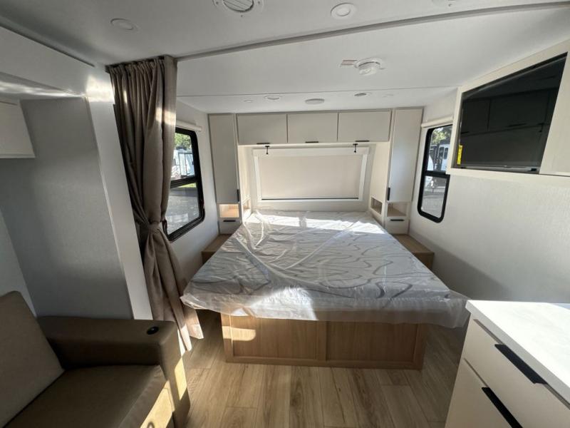 It will be so easy to enjoy camping trips in this compact travel trailer. The jack knife sofa slide provides more floor space plus a place for an overnight guest to sleep. You'll find an Olympic queen bed up front with a privacy curtain and dual bedroom wardrobes to keep your things tidy. A recessed three burner cooktop with an oven will let you make meals each day, and the 10.6 cu. ft. 12V refrigerator will keep your cold items fresh. There is also a pantry with pull-out shelves for added storage space. The full bath includes a power vent fan and a shower skylight that will give you more lighting and extra head room as you get ready each day!