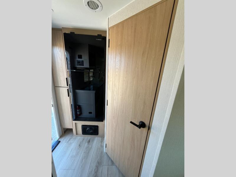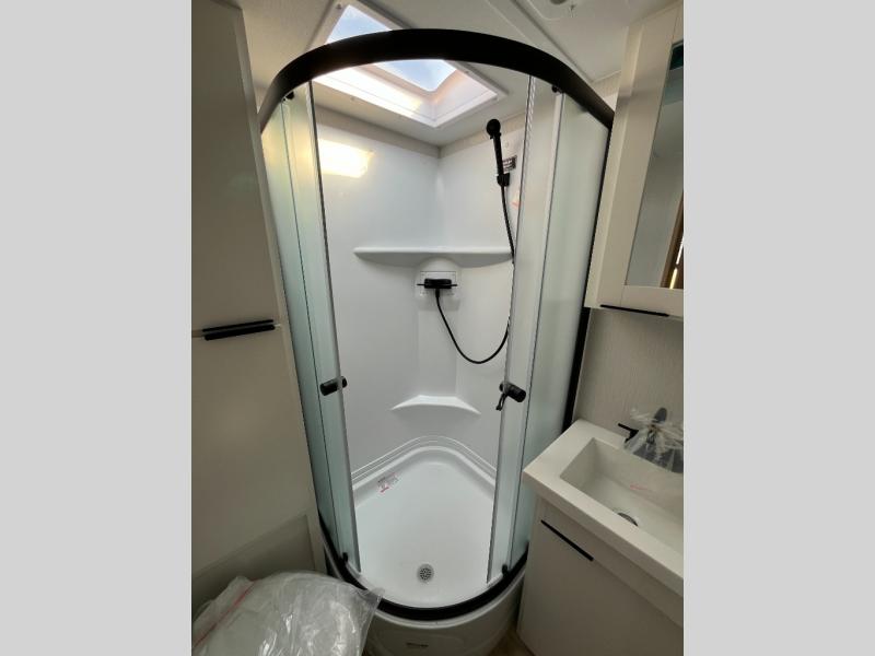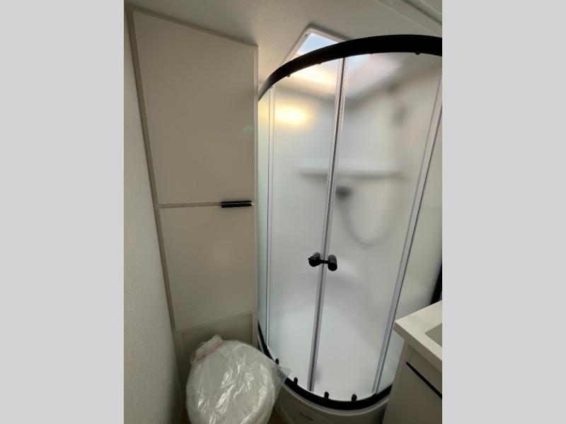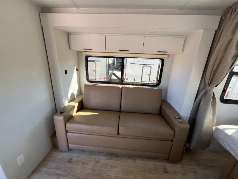 It will be so easy to enjoy camping trips in this compact travel trailer. The jack knife sofa slide provides more floor space plus a place for an overnight guest to sleep. You'll find an Olympic queen bed up front with a privacy curtain and dual bedroom wardrobes to keep your things tidy. A recessed three burner cooktop with an oven will let you make meals each day, and the 10.6 cu. ft. 12V refrigerator will keep your cold items fresh. There is also a pantry with pull-out shelves for added storage space. The full bath includes a power vent fan and a shower skylight that will give you more lighting and extra head room as you get ready each day!