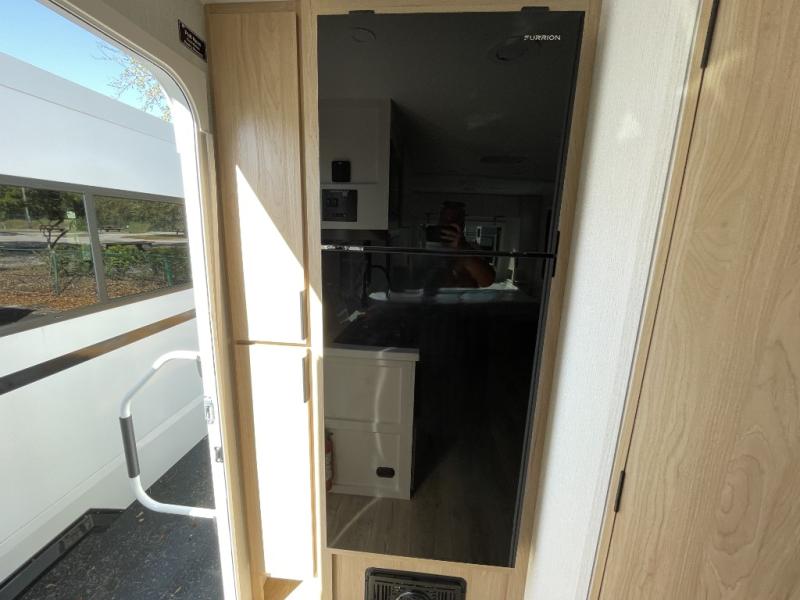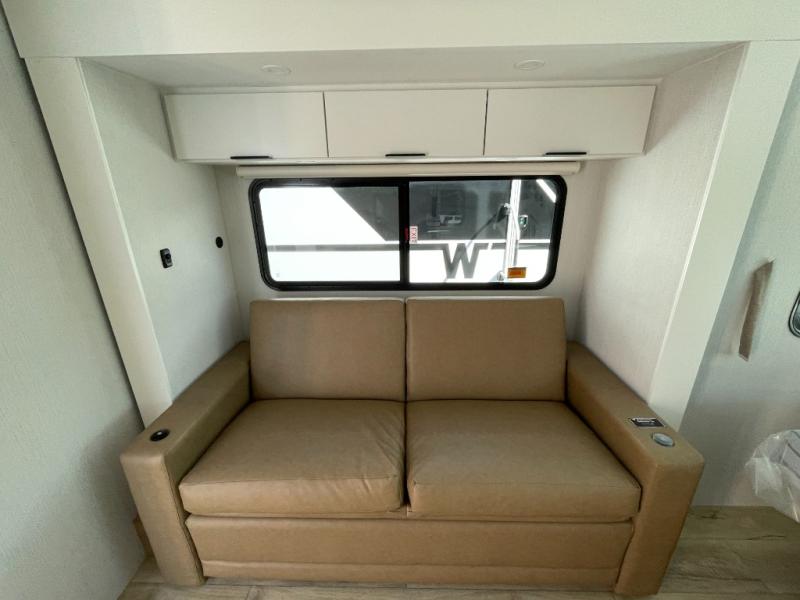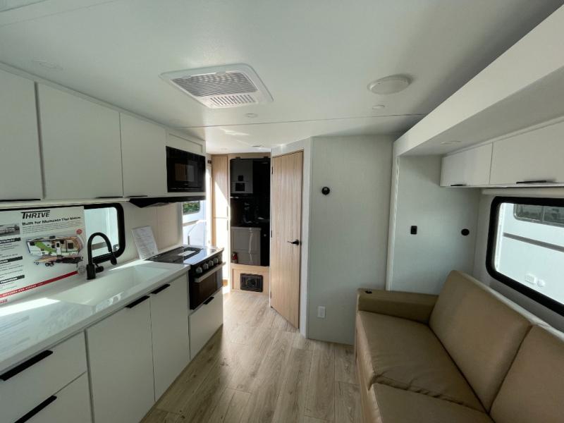With any Thrive travel trailer by Winnebago, you can camp with functionality, comfort, and convenience! The large front viewing window will be the first thing that catches your eye, and the fiberglass sidewalls with Azdel Onboard provide a durable trailer made to last. There is also an exterior ladder, along with front radius profile lights, power stabilizer jacks, and a powered awning with LED lighting to name a few exterior features. You will stay powered up by the 30-amp power cord and 200-watt solar panel, plus there is a tankless water heater for endless hot showers. Inside, you'll love the custom Winnebago furniture, carpetless side outs, molded fiberglass countertops, and residential recessed ceiling lights to keep your space well lit!