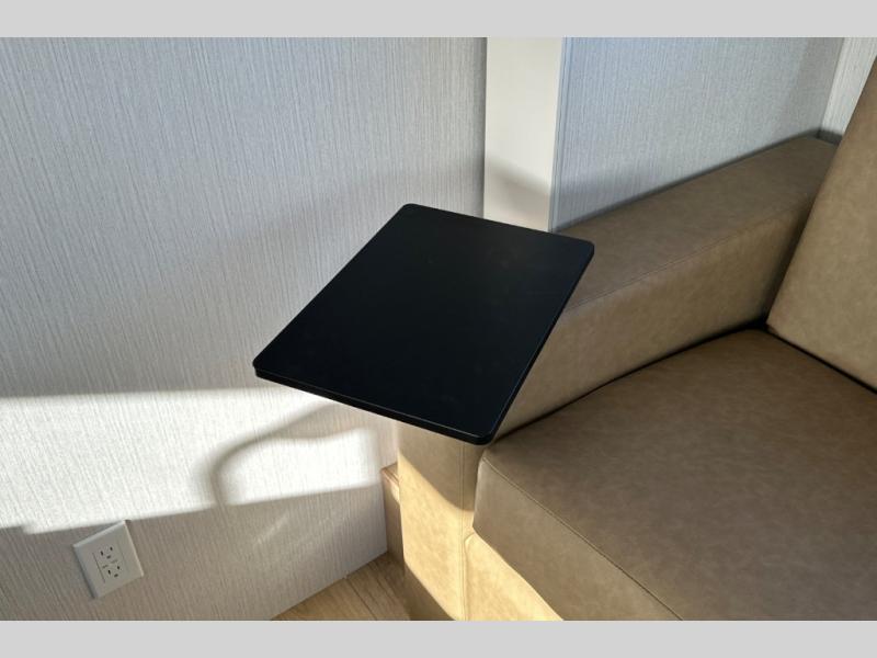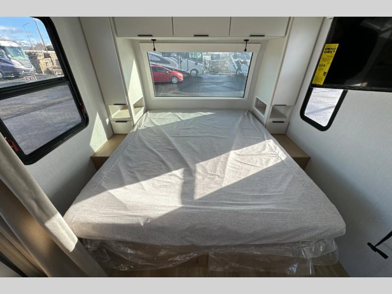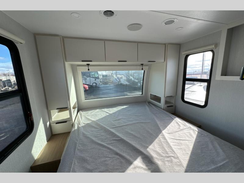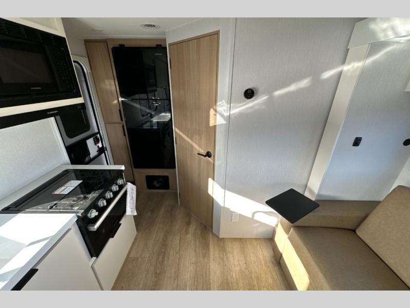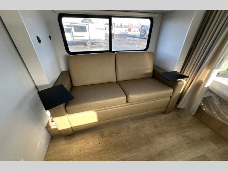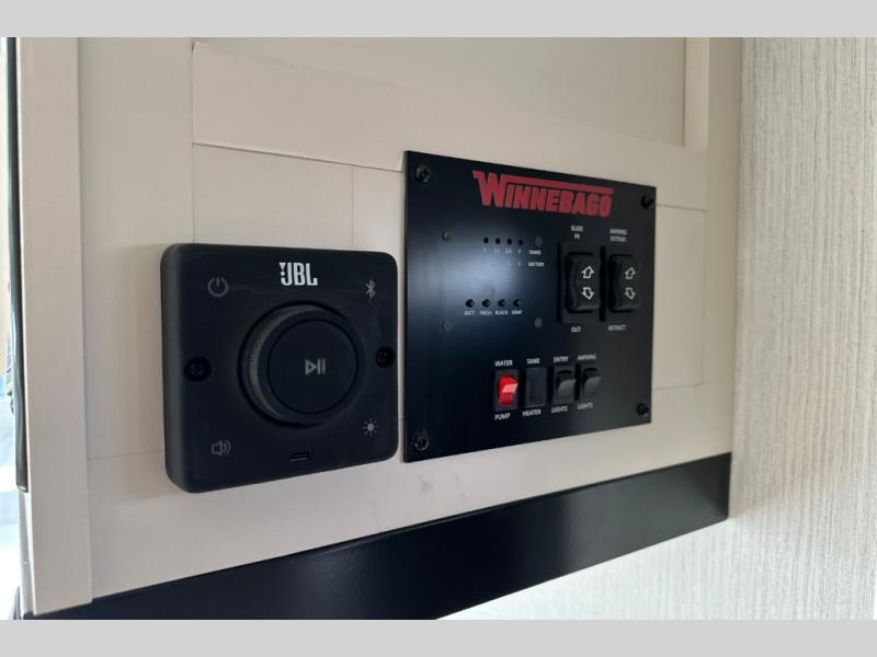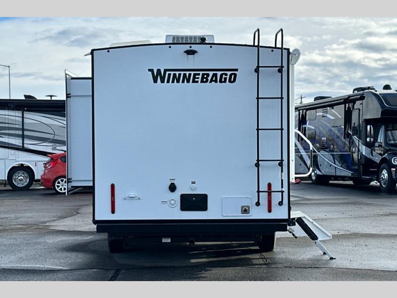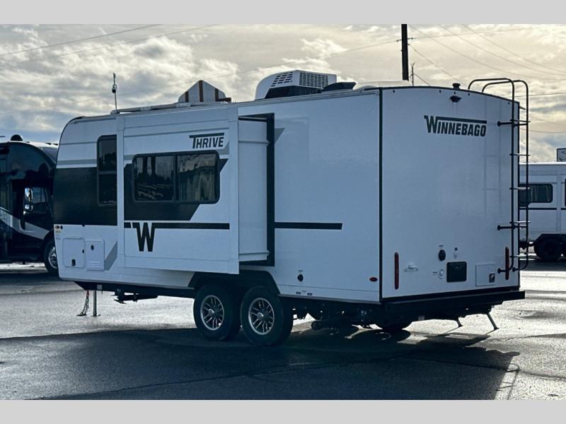 With any Thrive travel trailer by Winnebago, you can camp with functionality, comfort, and convenience! The large front viewing window will be the first thing that catches your eye, and the fiberglass sidewalls with Azdel Onboard provide a durable trailer made to last. There is also an exterior ladder, along with front radius profile lights, power stabilizer jacks, and a powered awning with LED lighting to name a few exterior features. You will stay powered up by the 30-amp power cord and 200-watt solar panel, plus there is a tankless water heater for endless hot showers. Inside, you'll love the custom Winnebago furniture, carpetless side outs, molded fiberglass countertops, and residential recessed ceiling lights to keep your space well lit!