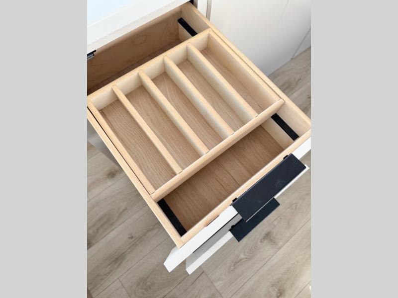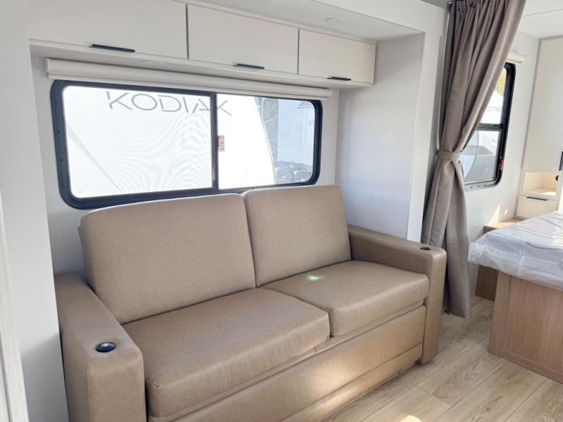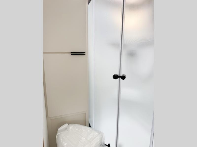 It will be so easy to enjoy camping trips in this compact travel trailer. The jack knife sofa slide provides more floor space plus a place for an overnight guest to sleep. You'll find an Olympic queen bed up front with a privacy curtain and dual bedroom wardrobes to keep your things tidy. A recessed three burner cooktop with an oven will let you make meals each day, and the 10.6 cu. ft. 12V refrigerator will keep your cold items fresh. There is also a pantry with pull-out shelves for added storage space. The full bath includes a power vent fan and a shower skylight that will give you more lighting and extra head room as you get ready each day!