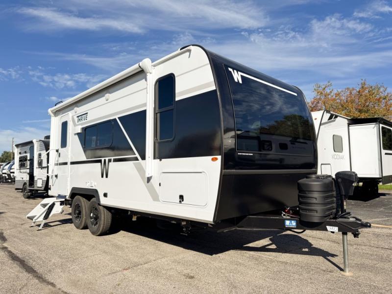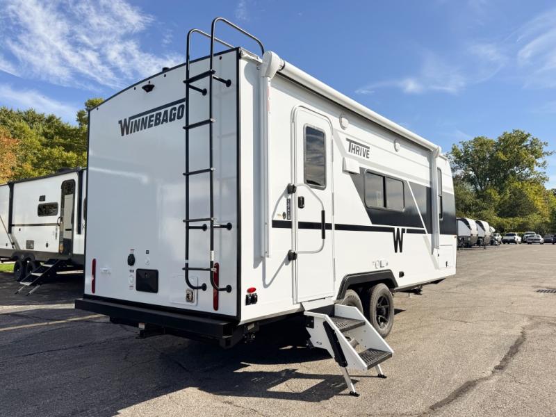 With any Thrive travel trailer by Winnebago, you can camp with functionality, comfort, and convenience! The large front viewing window will be the first thing that catches your eye, and the fiberglass sidewalls with Azdel Onboard provide a durable trailer made to last. There is also an exterior ladder, along with front radius profile lights, power stabilizer jacks, and a powered awning with LED lighting to name a few exterior features. You will stay powered up by the 30-amp power cord and 200-watt solar panel, plus there is a tankless water heater for endless hot showers. Inside, you'll love the custom Winnebago furniture, carpetless side outs, molded fiberglass countertops, and residential recessed ceiling lights to keep your space well lit!