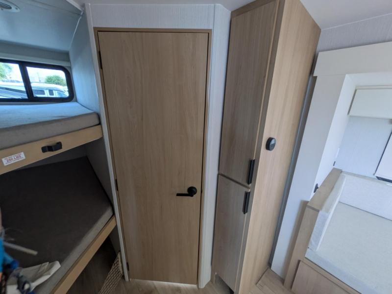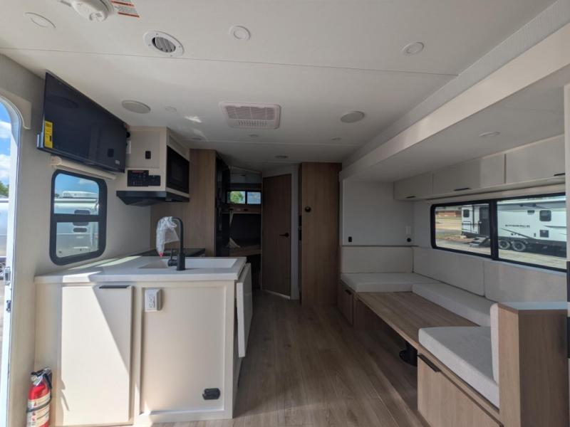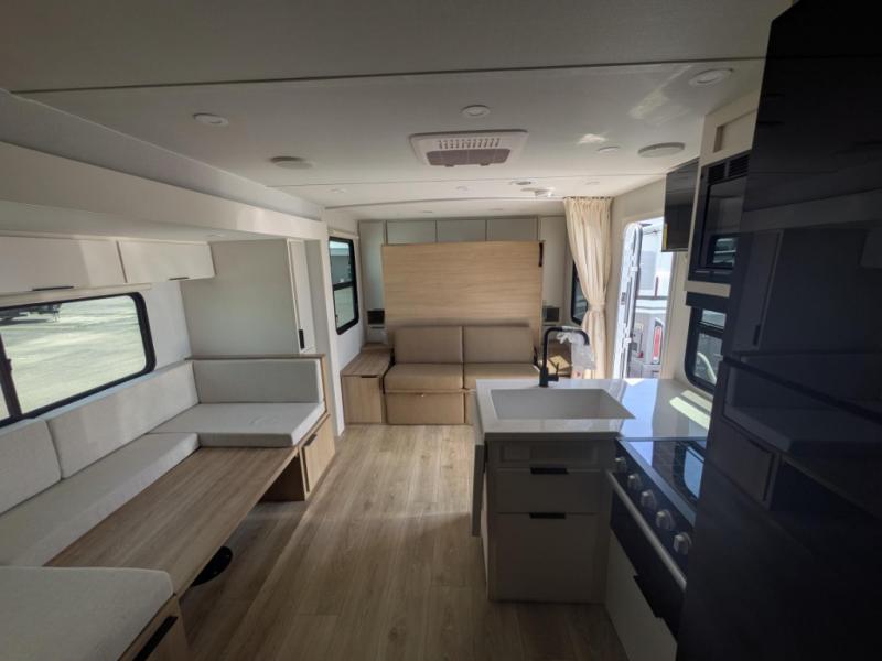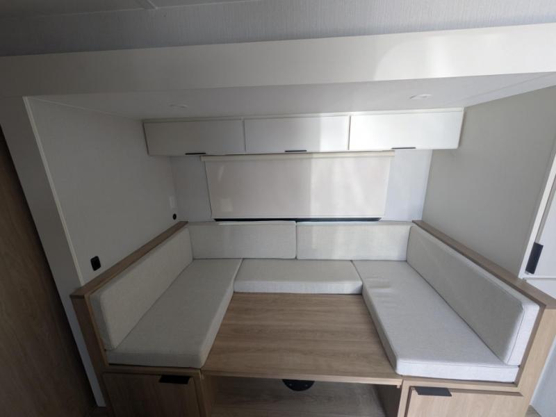 If you enjoy camping with a larger group, the 2026 Winnebago Thrive 22MBH is designed just for you. This spacious travel trailer offers double-over-double bunk beds in the rear, perfect for kids or guests, while the U-shaped dinette within a slide gives you additional sleeping space and plenty of room to gather around for meals or games. Up front, the king-size Murphy bed offers versatility—fold it down for a restful night or stow it away to create extra living space during the day.