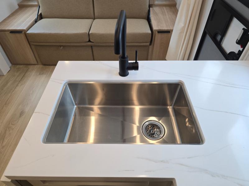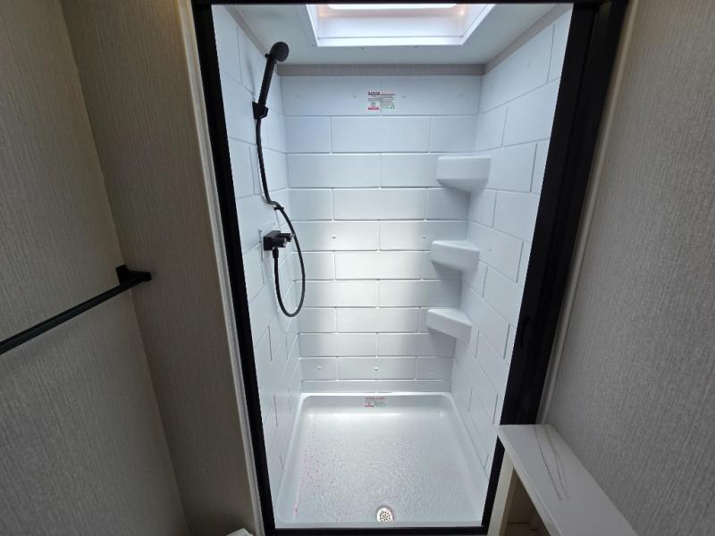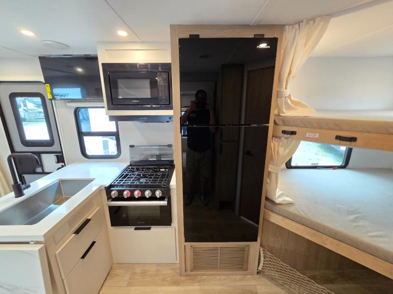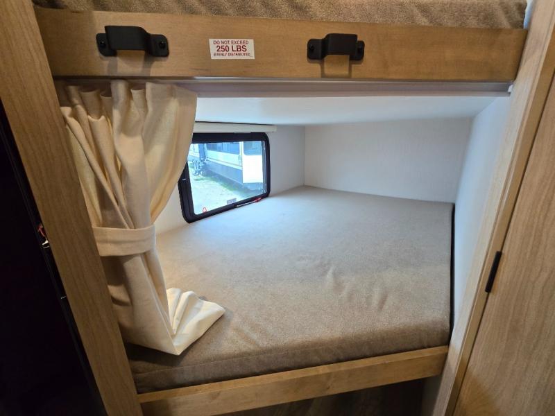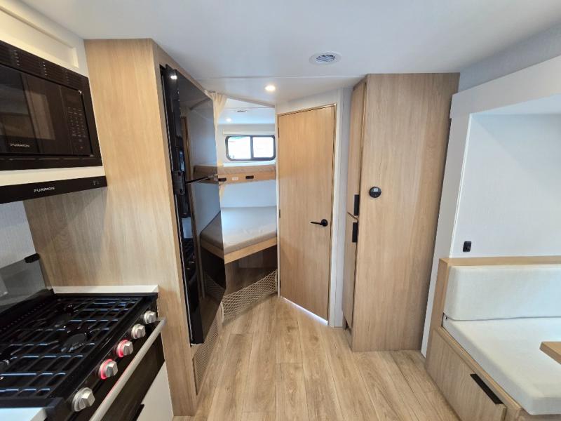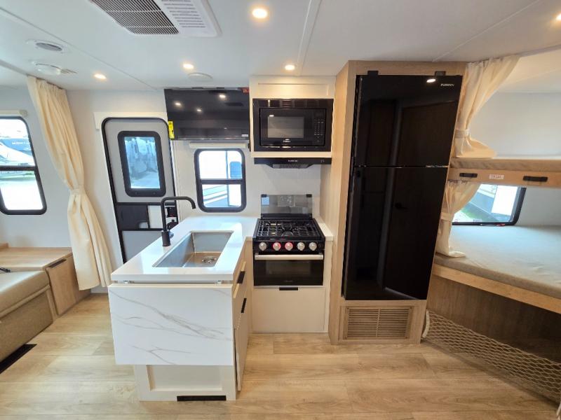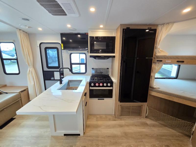 If you enjoy camping with a larger group, this travel trailer with double-size bunks is sure to be a fit! There is also a U-shaped dinette within a slide for more sleeping space, and you'll find the front king-size Murphy bed to be very versatile. A recessed three burner cooktop with an oven will let you make meals each day, and the 10.6 cu. ft. 12V refrigerator will keep your cold items fresh. There is also a countertop extension, giving you more space to prep meals. The full bath includes a power vent fan and a shower skylight that will give you additional lighting and extra head room as you get ready each day!