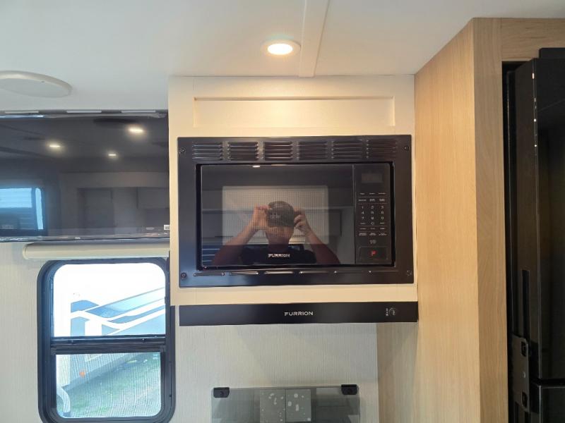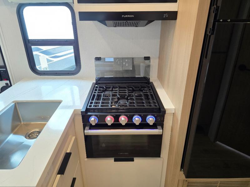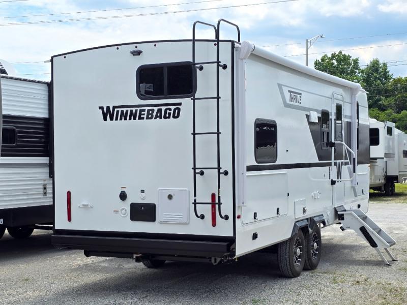 With any Thrive travel trailer by Winnebago, you can camp with functionality, comfort, and convenience! The tinted and frameless front window will be the first thing that catches your eye, and the fiberglass sidewalls with Azdel Onboard provide a durable trailer made to last. There is also an exterior ladder, along with front radius profile lights, power stabilizer jacks, and a powered awning with LED lighting to name a few exterior features. You will stay powered up by the 30-amp power cord and 200-watt solar panel, plus there is a tankless water heater for endless hot showers. Inside, you'll love the custom Winnebago furniture, carpetless side outs, molded fiberglass countertops, and residential recessed ceiling lights to keep your space well lit!