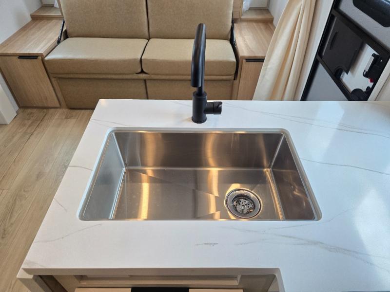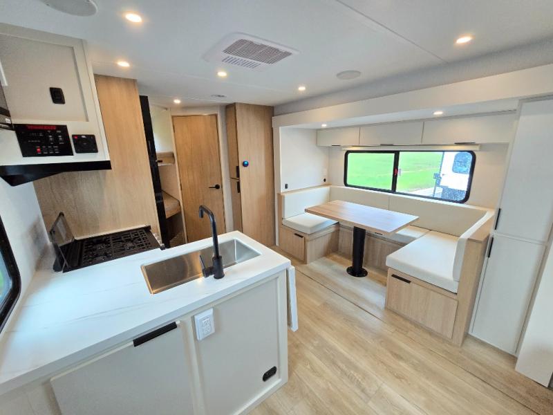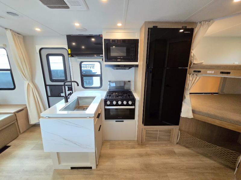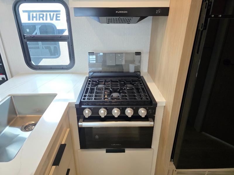 With any Thrive travel trailer by Winnebago, you can camp with functionality, comfort, and convenience! The tinted and frameless front window will be the first thing that catches your eye, and the fiberglass sidewalls with Azdel Onboard provide a durable trailer made to last. There is also an exterior ladder, along with front radius profile lights, power stabilizer jacks, and a powered awning with LED lighting to name a few exterior features. You will stay powered up by the 30-amp power cord and 200-watt solar panel, plus there is a tankless water heater for endless hot showers. Inside, you'll love the custom Winnebago furniture, carpetless side outs, molded fiberglass countertops, and residential recessed ceiling lights to keep your space well lit!