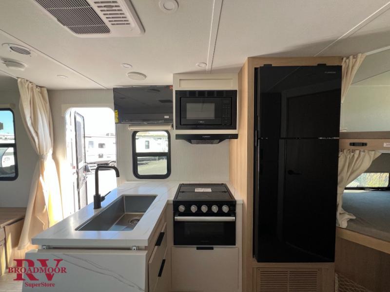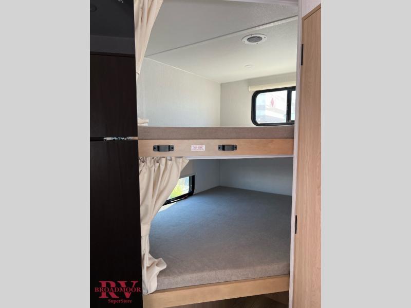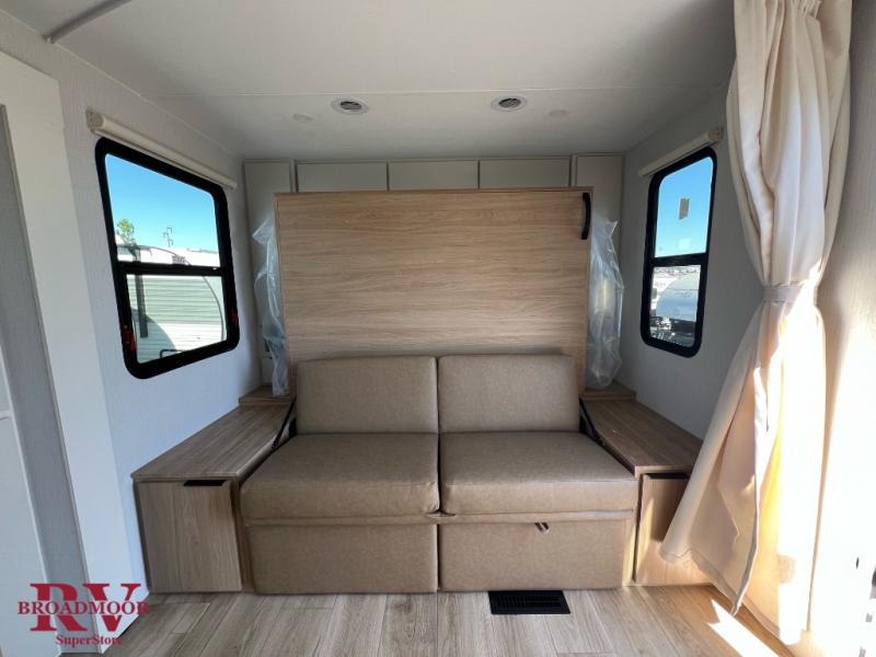 If you enjoy camping with a larger group, this travel trailer with double-size bunks is sure to be a fit! There is also a U-shaped dinette within a slide for more sleeping space, and you'll find the front king-size Murphy bed to be very versatile. A recessed three burner cooktop with an oven will let you make meals each day, and the 10.6 cu. ft. 12V refrigerator will keep your cold items fresh. There is also a countertop extension, giving you more space to prep meals. The full bath includes a power vent fan and a shower skylight that will give you additional lighting and extra head room as you get ready each day!