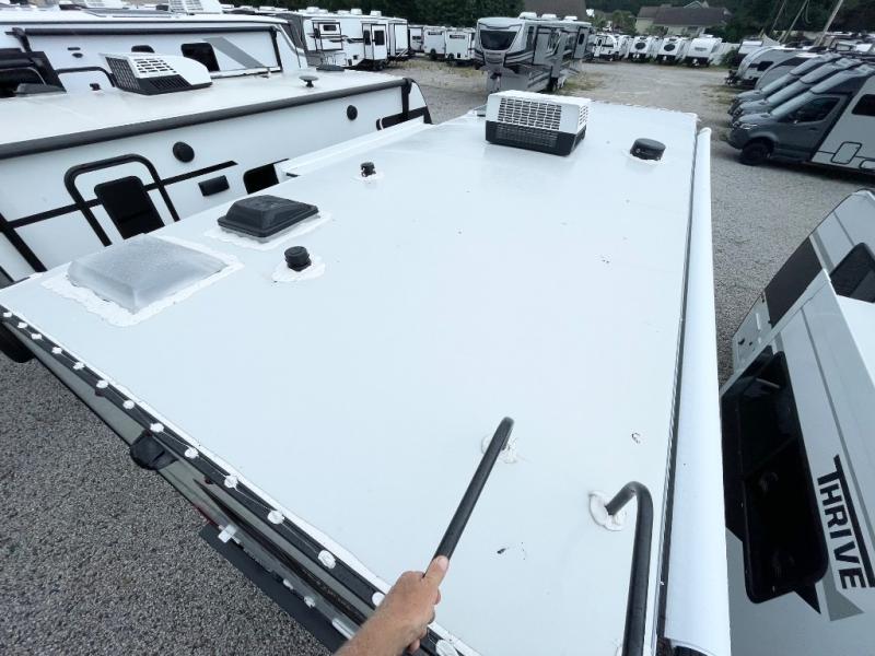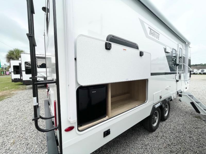 With any Thrive travel trailer by Winnebago, you can camp with functionality, comfort, and convenience! The tinted and frameless front window will be the first thing that catches your eye, and the fiberglass sidewalls with Azdel Onboard provide a durable trailer made to last. There is also an exterior ladder, along with front radius profile lights, power stabilizer jacks, and a powered awning with LED lighting to name a few exterior features. You will stay powered up by the 30-amp power cord and 200-watt solar panel, plus there is a tankless water heater for endless hot showers. Inside, you'll love the custom Winnebago furniture, carpetless side outs, molded fiberglass countertops, and residential recessed ceiling lights to keep your space well lit!