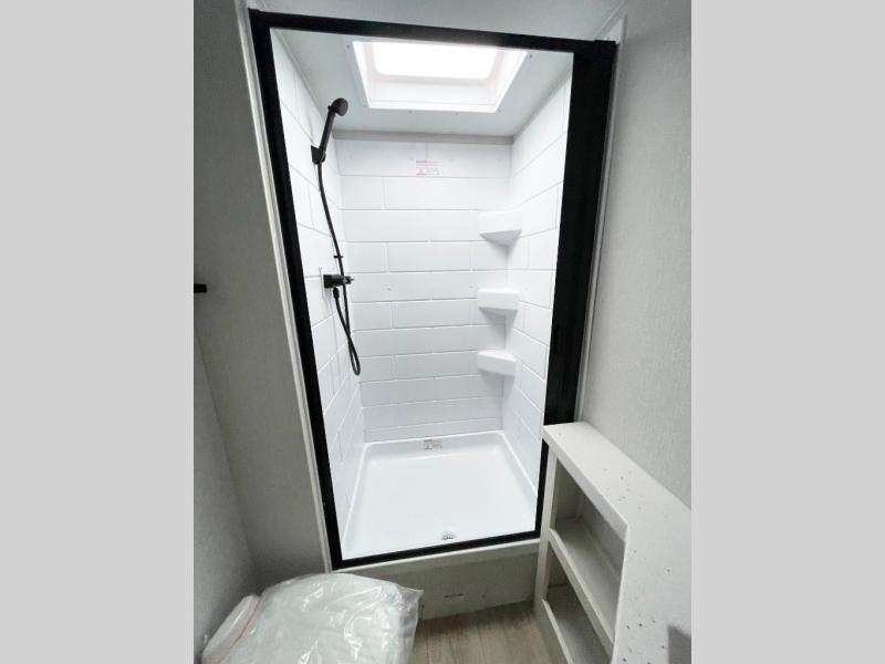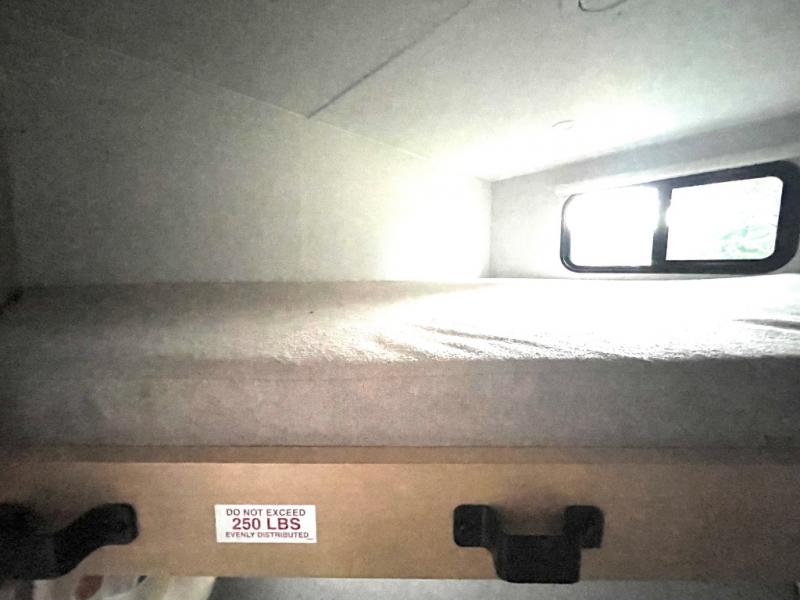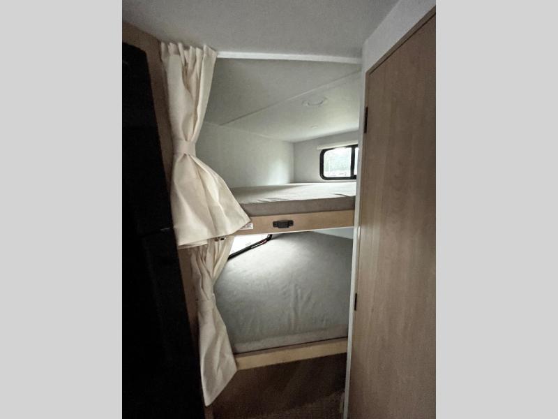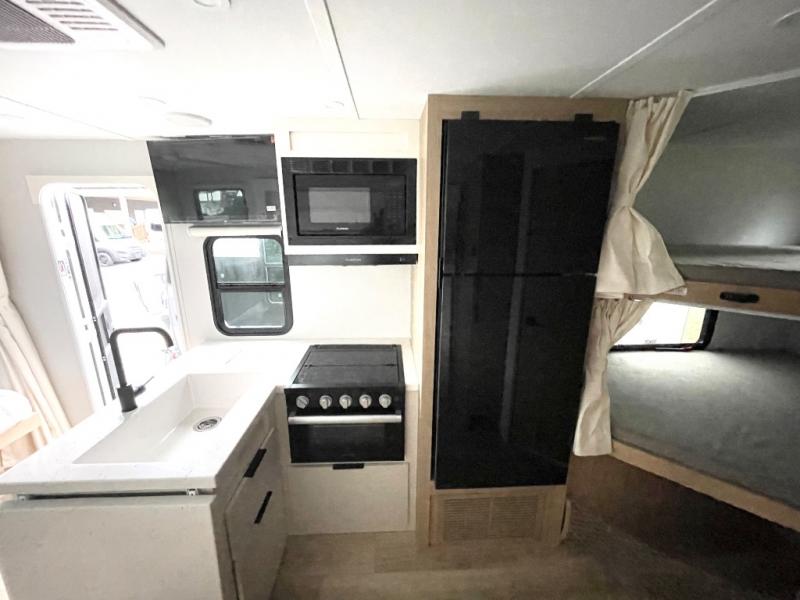 If you enjoy camping with a larger group, this travel trailer with double-size bunks is sure to be a fit! There is also a U-shaped dinette within a slide for more sleeping space, and you'll find the front king-size Murphy bed to be very versatile. A recessed three burner cooktop with an oven will let you make meals each day, and the 10.6 cu. ft. 12V refrigerator will keep your cold items fresh. There is also a countertop extension, giving you more space to prep meals. The full bath includes a power vent fan and a shower skylight that will give you additional lighting and extra head room as you get ready each day!