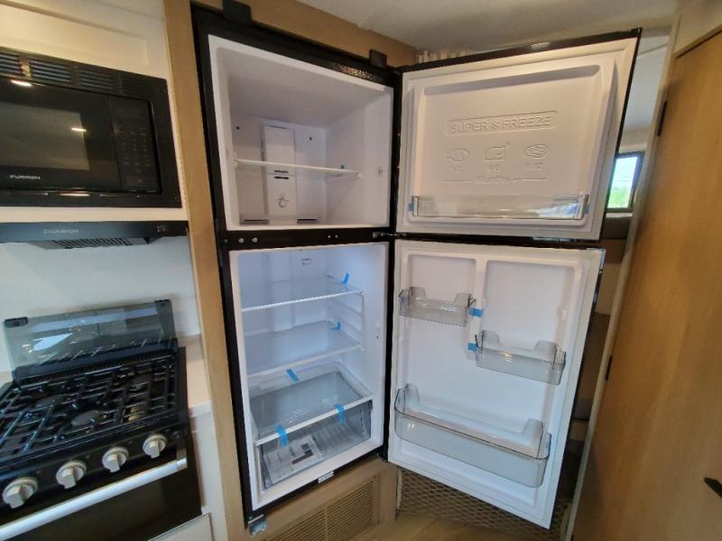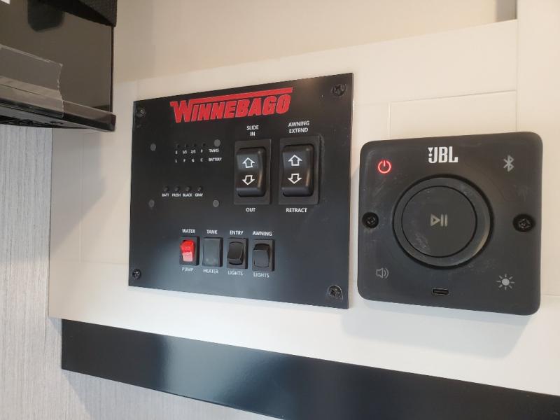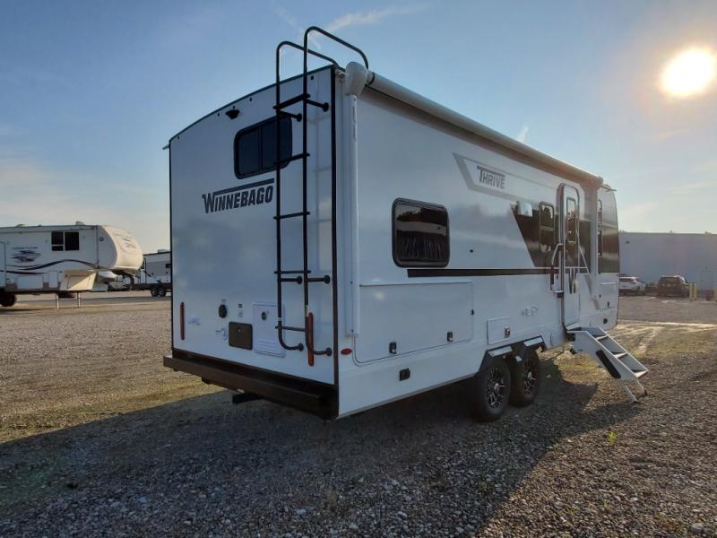 With any Thrive travel trailer by Winnebago, you can camp with functionality, comfort, and convenience! The tinted and frameless front window will be the first thing that catches your eye, and the fiberglass sidewalls with Azdel Onboard provide a durable trailer made to last. There is also an exterior ladder, along with front radius profile lights, power stabilizer jacks, and a powered awning with LED lighting to name a few exterior features. You will stay powered up by the 30-amp power cord and 200-watt solar panel, plus there is a tankless water heater for endless hot showers. Inside, you'll love the custom Winnebago furniture, carpetless side outs, molded fiberglass countertops, and residential recessed ceiling lights to keep your space well lit!