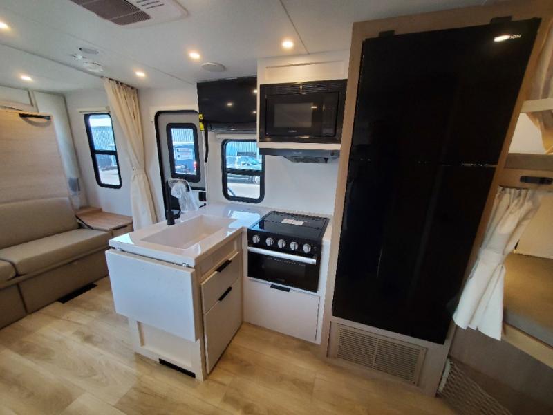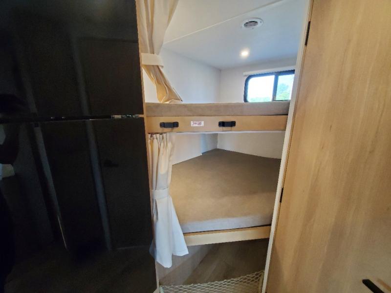 If you enjoy camping with a larger group, this travel trailer with double-size bunks is sure to be a fit! There is also a U-shaped dinette within a slide for more sleeping space, and you'll find the front king-size Murphy bed to be very versatile. A recessed three burner cooktop with an oven will let you make meals each day, and the 10.6 cu. ft. 12V refrigerator will keep your cold items fresh. There is also a countertop extension, giving you more space to prep meals. The full bath includes a power vent fan and a shower skylight that will give you additional lighting and extra head room as you get ready each day!