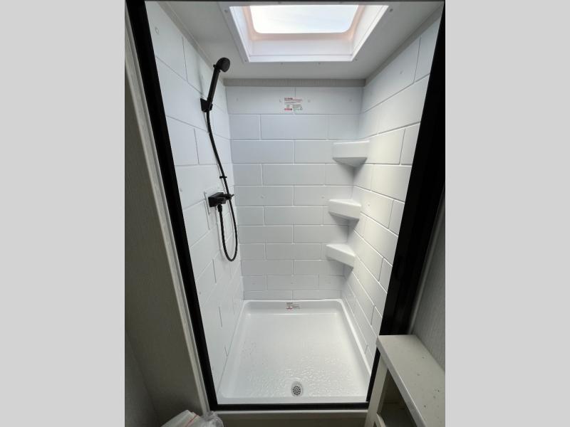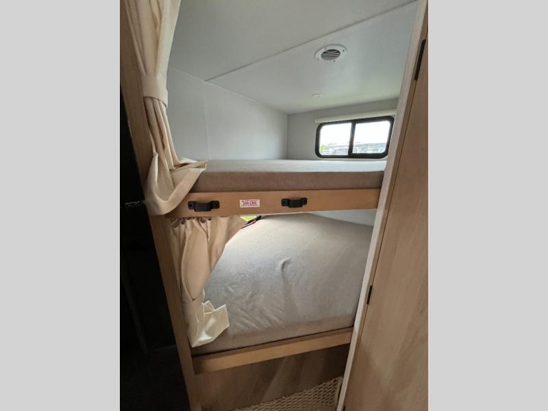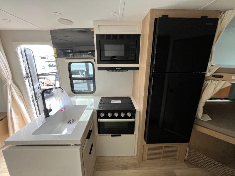 If you enjoy camping with a larger group, this travel trailer with double-size bunks is sure to be a fit! There is also a U-shaped dinette within a slide for more sleeping space, and you'll find the front king-size Murphy bed to be very versatile. A recessed three burner cooktop with an oven will let you make meals each day, and the 10.6 cu. ft. 12V refrigerator will keep your cold items fresh. There is also a countertop extension, giving you more space to prep meals. The full bath includes a power vent fan and a shower skylight that will give you additional lighting and extra head room as you get ready each day!
