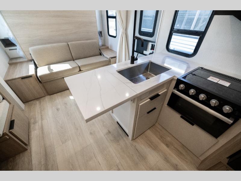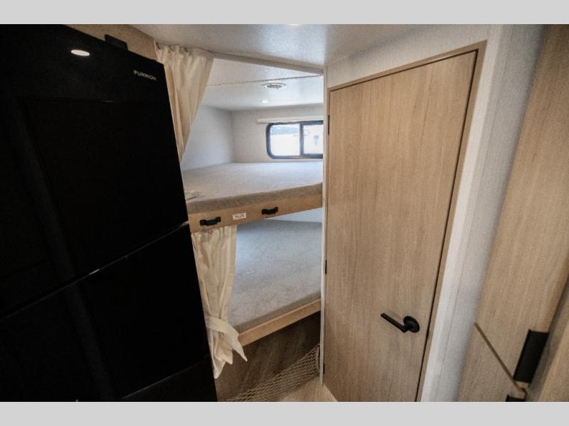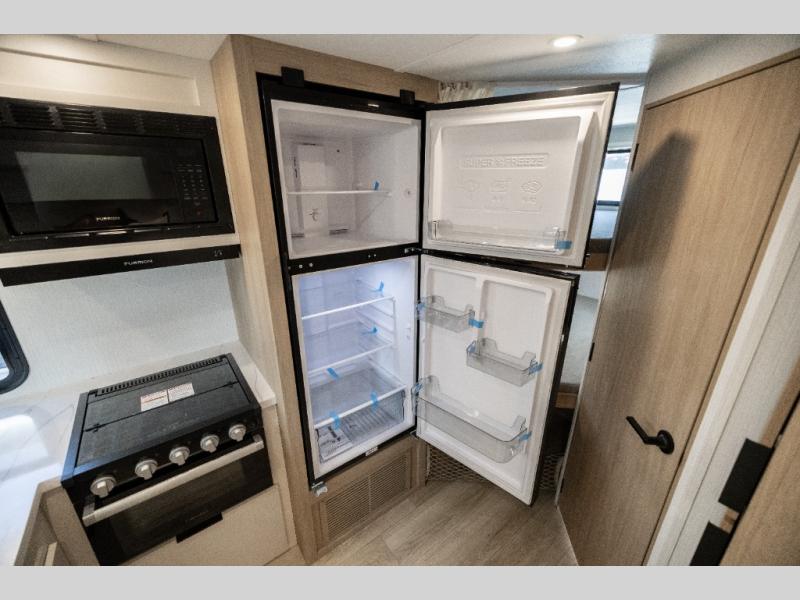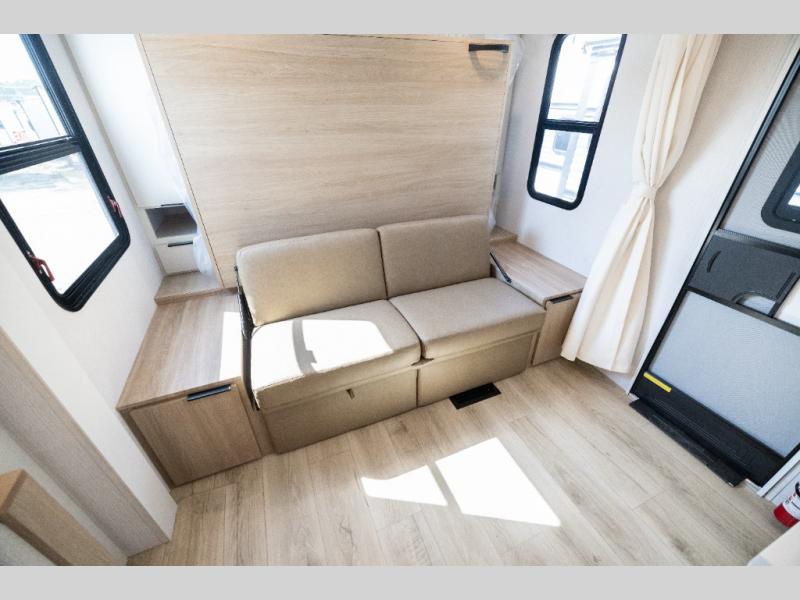 If you enjoy camping with a larger group, this travel trailer with double-size bunks is sure to be a fit! There is also a U-shaped dinette within a slide for more sleeping space, and you'll find the front king-size Murphy bed to be very versatile. A recessed three burner cooktop with an oven will let you make meals each day, and the 10.6 cu. ft. 12V refrigerator will keep your cold items fresh. There is also a countertop extension, giving you more space to prep meals. The full bath includes a power vent fan and a shower skylight that will give you additional lighting and extra head room as you get ready each day!