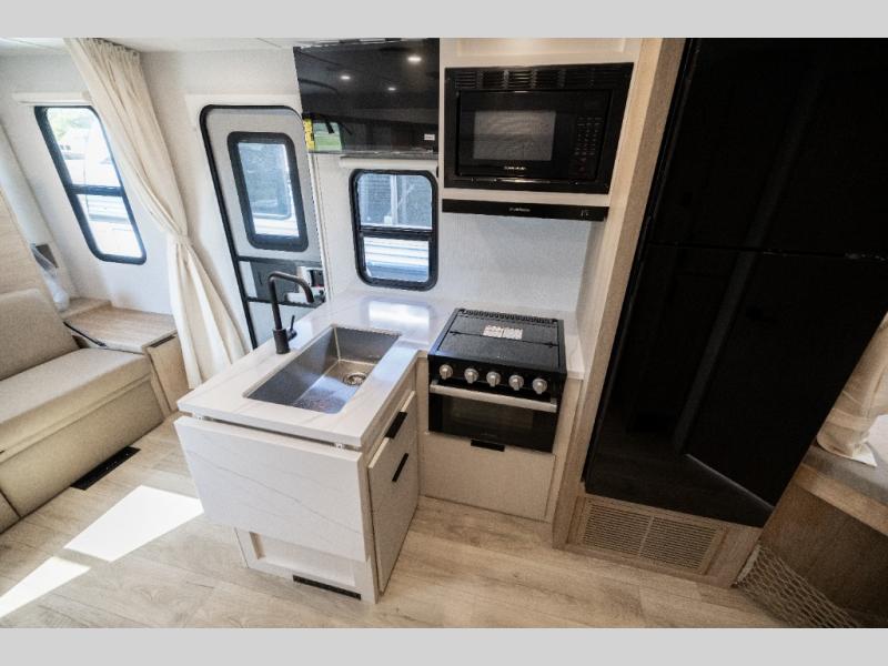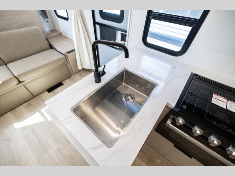 With any Thrive travel trailer by Winnebago, you can camp with functionality, comfort, and convenience! The tinted and frameless front window will be the first thing that catches your eye, and the fiberglass sidewalls with Azdel Onboard provide a durable trailer made to last. There is also an exterior ladder, along with front radius profile lights, power stabilizer jacks, and a powered awning with LED lighting to name a few exterior features. You will stay powered up by the 30-amp power cord and 200-watt solar panel, plus there is a tankless water heater for endless hot showers. Inside, you'll love the custom Winnebago furniture, carpetless side outs, molded fiberglass countertops, and residential recessed ceiling lights to keep your space well lit!