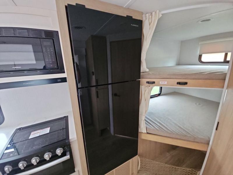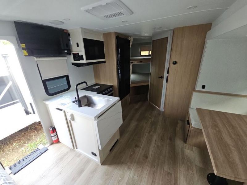 If you enjoy camping with a larger group, this travel trailer with double-size bunks is sure to be a fit! There is also a U-shaped dinette within a slide for more sleeping space, and you'll find the front Olympic Queen Murphy bed to be very versatile. A recessed three burner cooktop with an oven will let you make meals each day, and the 10.6 cu. ft. 12V refrigerator will keep your cold items fresh. There is also a countertop extension, giving you more space to prep meals. The full bath includes a power vent fan and a shower skylight that will give you additional lighting and extra head room as you get ready each day!