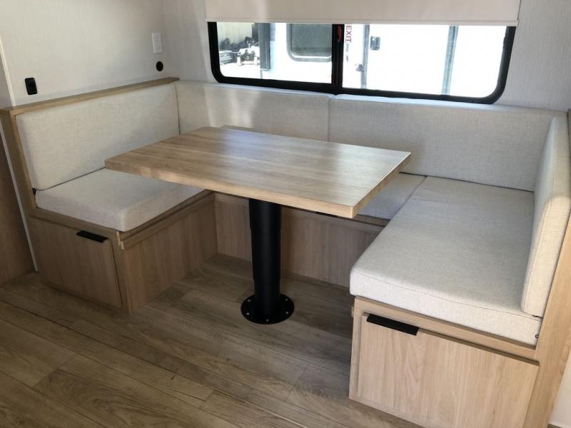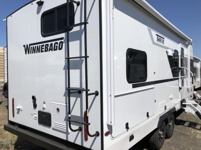 With any Thrive travel trailer by Winnebago, you can camp with functionality, comfort, and convenience! The large front viewing window with strike guard will be the first thing that catches your eye, and the fiberglass sidewalls with Azdel Onboard provide a durable trailer made to last. There is also an exterior ladder, along with front radius profile lights, power stabilizer jacks, and a powered awning with LED lighting to name a few exterior features. You will stay powered up by the 30-amp power cord and 200-watt solar panel, plus there is a tankless water heater for endless hot showers. Inside, you'll love the custom Winnebago furniture, carpetless side outs, molded fiberglass countertops, and residential recessed ceiling lights to keep your space well lit!