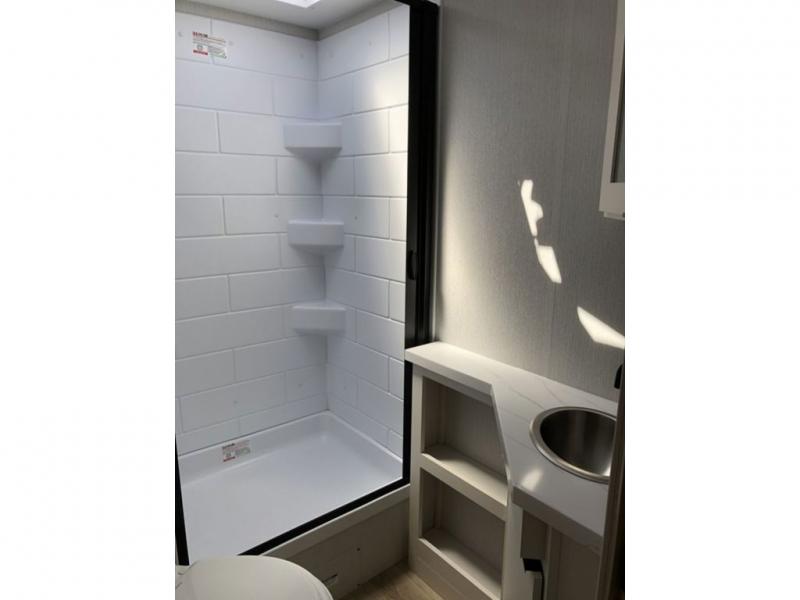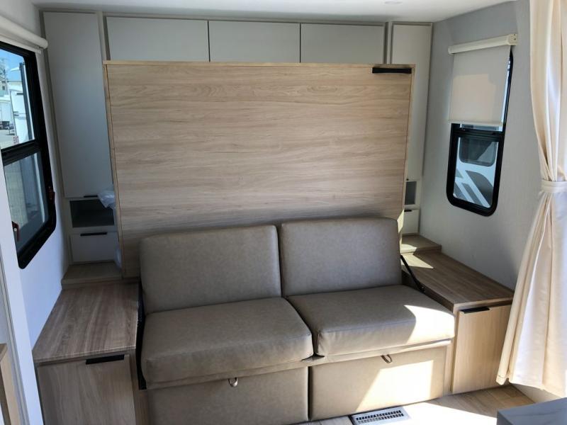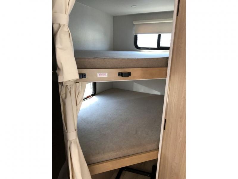 If you enjoy camping with a larger group, this travel trailer with double-size bunks is sure to be a fit! There is also a U-shaped dinette within a slide for more sleeping space, and you'll find the front Olympic Queen Murphy bed to be very versatile. A recessed three burner cooktop with an oven will let you make meals each day, and the 10.6 cu. ft. 12V refrigerator will keep your cold items fresh. There is also a countertop extension, giving you more space to prep meals. The full bath includes a power vent fan and a shower skylight that will give you additional lighting and extra head room as you get ready each day!