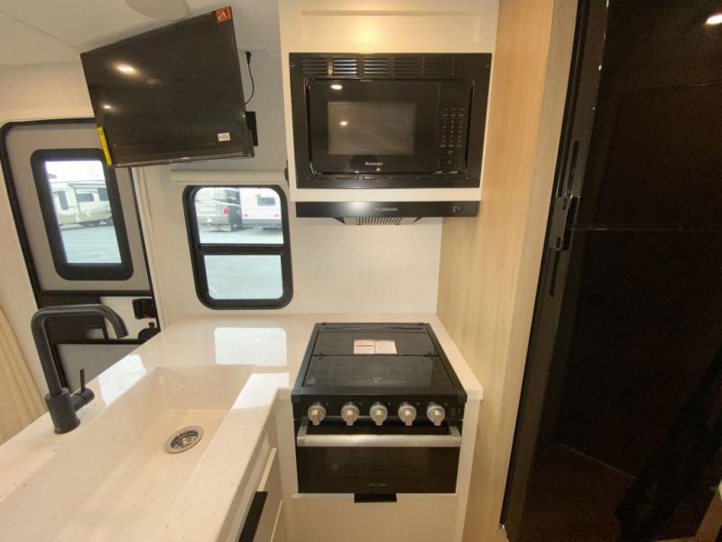 With any Thrive travel trailer by Winnebago, you can camp with functionality, comfort, and convenience! The large front viewing window with strike guard will be the first thing that catches your eye, and the fiberglass sidewalls with Azdel Onboard provide a durable trailer made to last. There is also an exterior ladder, along with front radius profile lights, power stabilizer jacks, and a powered awning with LED lighting to name a few exterior features. You will stay powered up by the 30-amp power cord and 200-watt solar panel, plus there is a tankless water heater for endless hot showers. Inside, you'll love the custom Winnebago furniture, carpetless side outs, molded fiberglass countertops, and residential recessed ceiling lights to keep your space well lit!