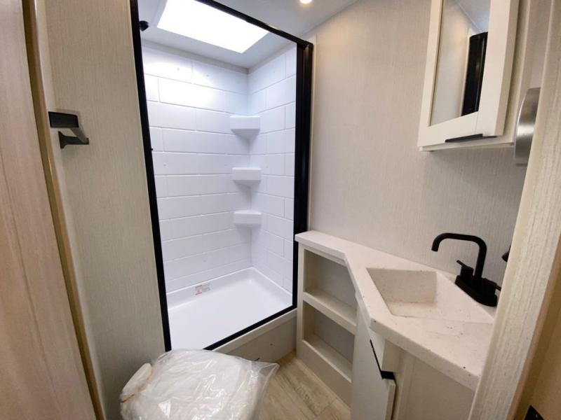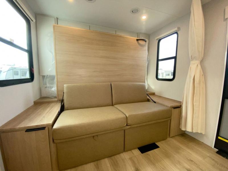 If you enjoy camping with a larger group, this travel trailer with double-size bunks is sure to be a fit! There is also a U-shaped dinette within a slide for more sleeping space, and you'll find the front Olympic Queen Murphy bed to be very versatile. A recessed three burner cooktop with an oven will let you make meals each day, and the 10.6 cu. ft. 12V refrigerator will keep your cold items fresh. There is also a countertop extension, giving you more space to prep meals. The full bath includes a power vent fan and a shower skylight that will give you additional lighting and extra head room as you get ready each day!