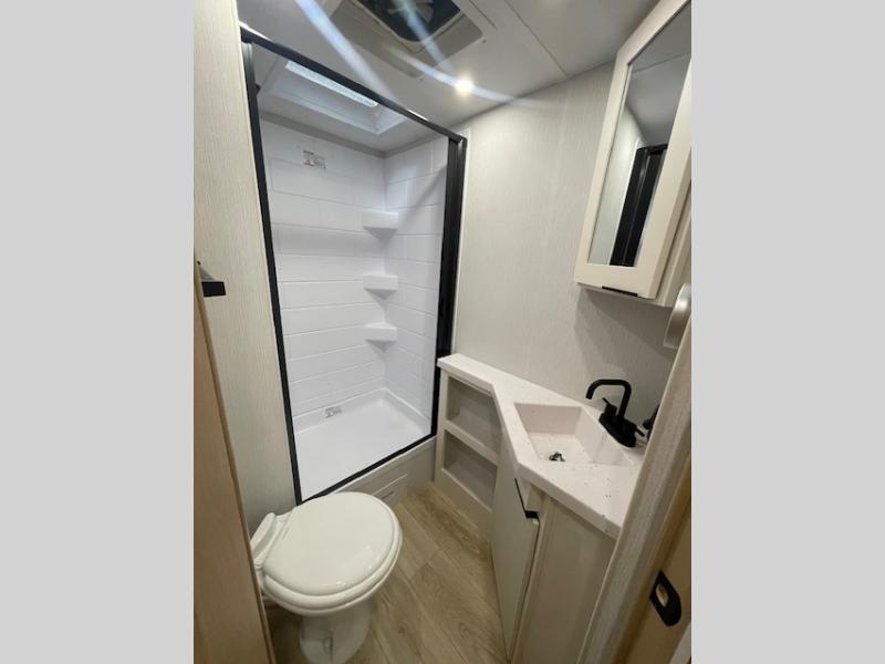 If you enjoy camping with a larger group, this travel trailer with double-size bunks is sure to be a fit! There is also a U-shaped dinette within a slide for more sleeping space, and you'll find the front Olympic Queen Murphy bed to be very versatile. A recessed three burner cooktop with an oven will let you make meals each day, and the 10.6 cu. ft. 12V refrigerator will keep your cold items fresh. There is also a countertop extension, giving you more space to prep meals. The full bath includes a power vent fan and a shower skylight that will give you additional lighting and extra head room as you get ready each day!