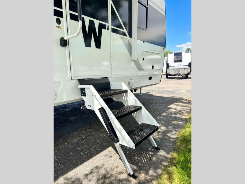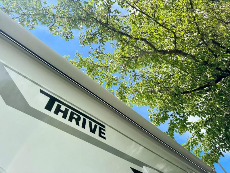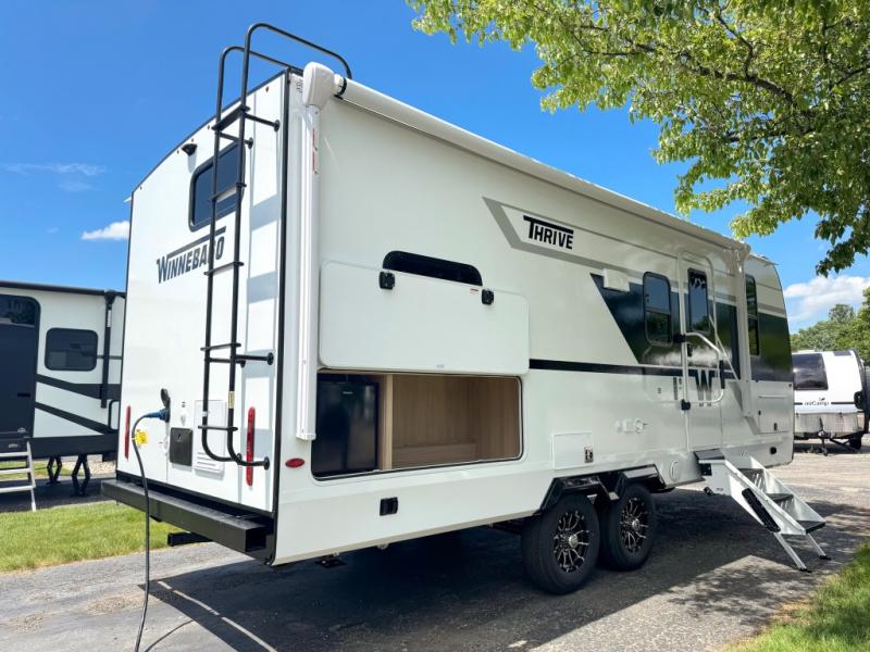 With any Thrive travel trailer by Winnebago, you can camp with functionality, comfort, and convenience! The large front viewing window with strike guard will be the first thing that catches your eye, and the fiberglass sidewalls with Azdel Onboard provide a durable trailer made to last. There is also an exterior ladder, along with front radius profile lights, power stabilizer jacks, and a powered awning with LED lighting to name a few exterior features. You will stay powered up by the 30-amp power cord and 200-watt solar panel, plus there is a tankless water heater for endless hot showers. Inside, you'll love the custom Winnebago furniture, carpetless side outs, molded fiberglass countertops, and residential recessed ceiling lights to keep your space well lit!
