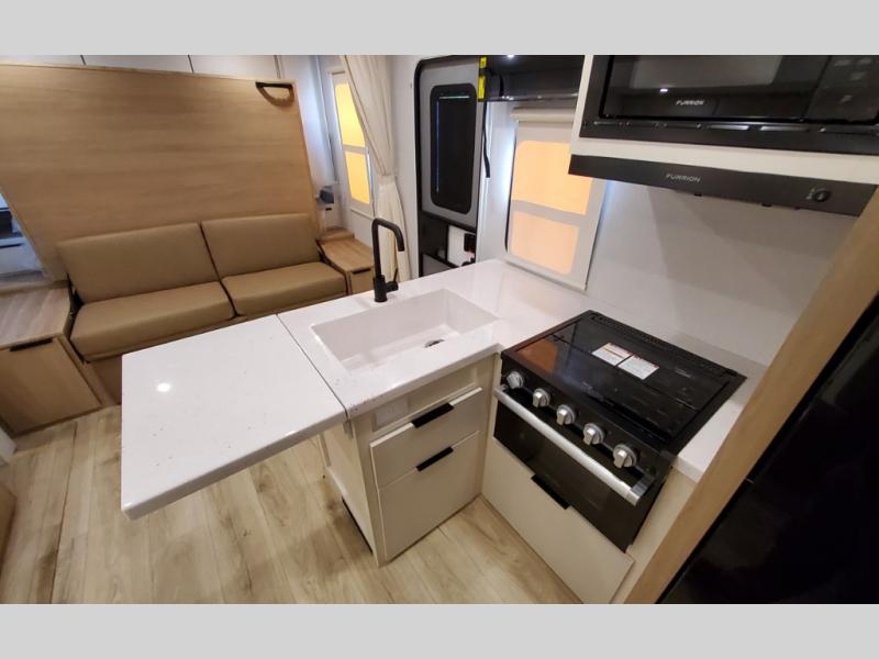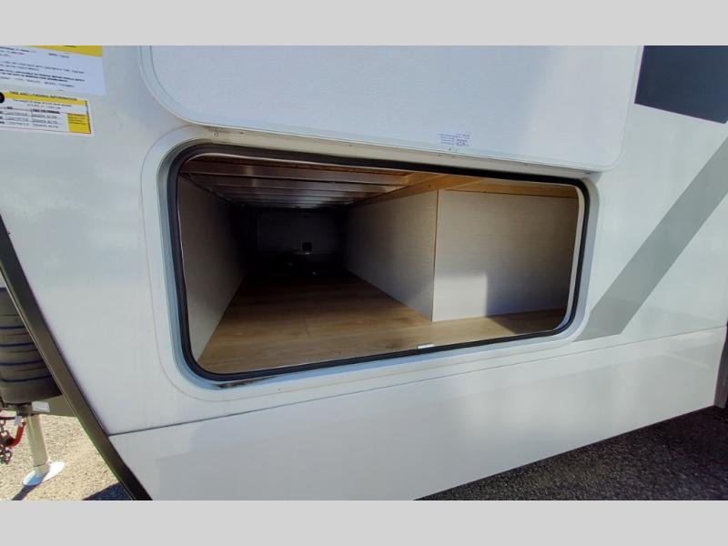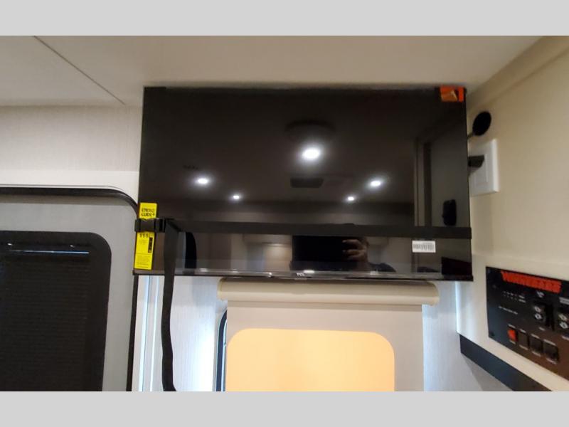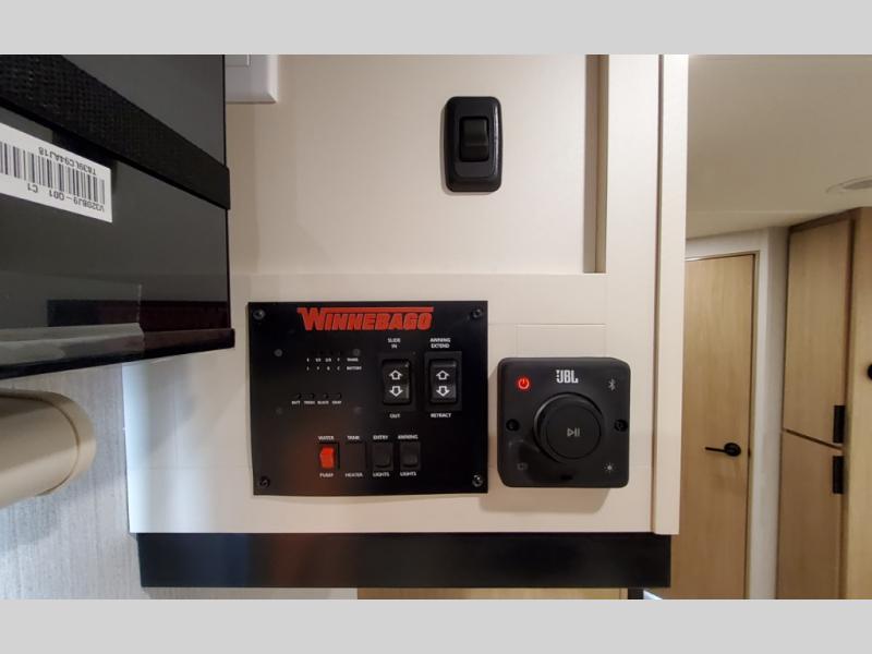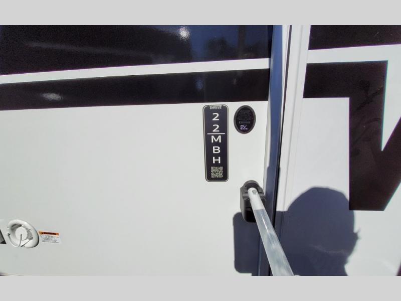 With any Thrive travel trailer by Winnebago, you can camp with functionality, comfort, and convenience! The large front viewing window with strike guard will be the first thing that catches your eye, and the fiberglass sidewalls with Azdel Onboard provide a durable trailer made to last. There is also an exterior ladder, along with front radius profile lights, power stabilizer jacks, and a powered awning with LED lighting to name a few exterior features. You will stay powered up by the 30-amp power cord and 200-watt solar panel, plus there is a tankless water heater for endless hot showers. Inside, you'll love the custom Winnebago furniture, carpetless side outs, molded fiberglass countertops, and residential recessed ceiling lights to keep your space well lit!