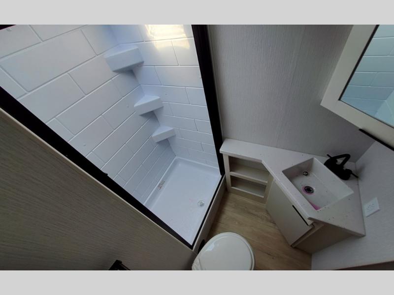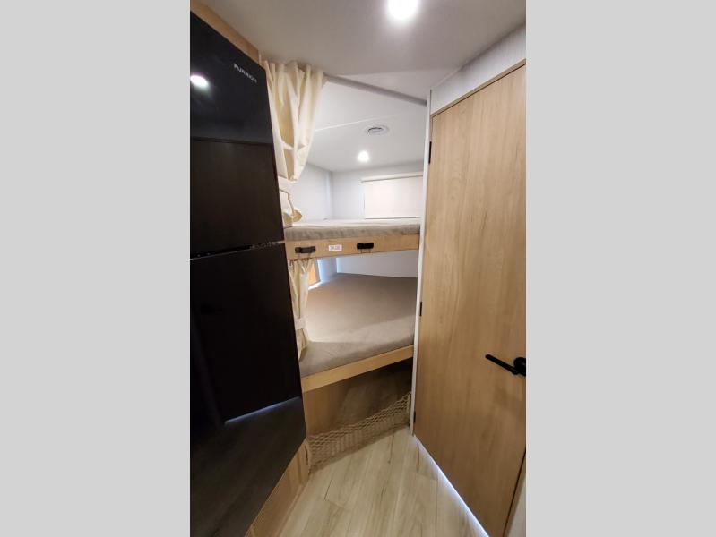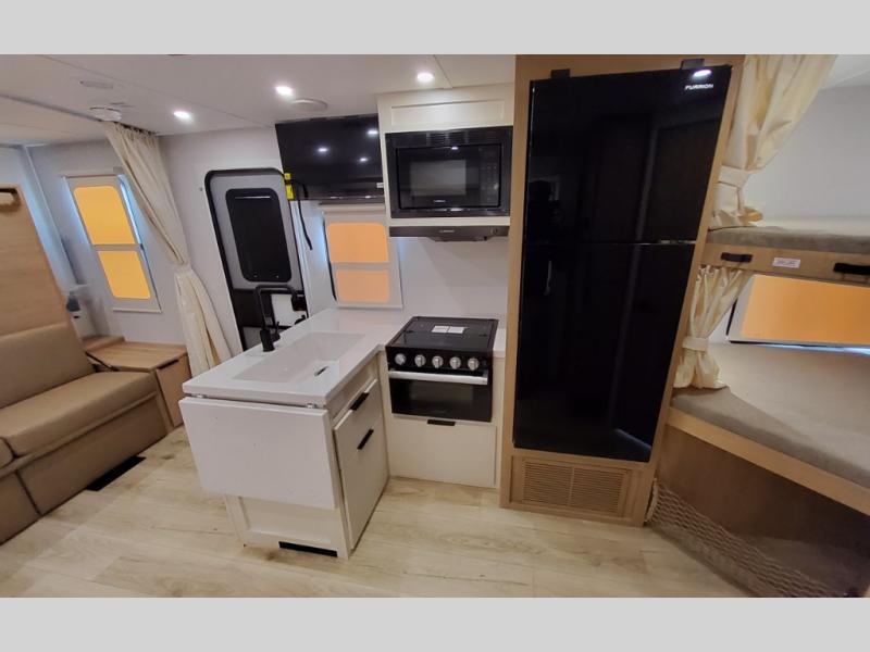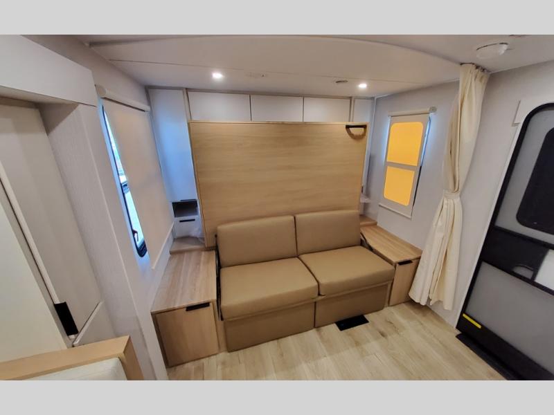 If you enjoy camping with a larger group, this travel trailer with double-size bunks is sure to be a fit! There is also a U-shaped dinette within a slide for more sleeping space, and you'll find the front Olympic Queen Murphy bed to be very versatile. A recessed three burner cooktop with an oven will let you make meals each day, and the 10.6 cu. ft. 12V refrigerator will keep your cold items fresh. There is also a countertop extension, giving you more space to prep meals. The full bath includes a power vent fan and a shower skylight that will give you additional lighting and extra head room as you get ready each day!