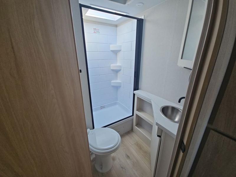 If you enjoy camping with a larger group, this travel trailer with double-size bunks is sure to be a fit! There is also a U-shaped dinette within a slide for more sleeping space, and you'll find the front Olympic Queen Murphy bed to be very versatile. A recessed three burner cooktop with an oven will let you make meals each day, and the 10.6 cu. ft. 12V refrigerator will keep your cold items fresh. There is also a countertop extension, giving you more space to prep meals. The full bath includes a power vent fan and a shower skylight that will give you additional lighting and extra head room as you get ready each day!