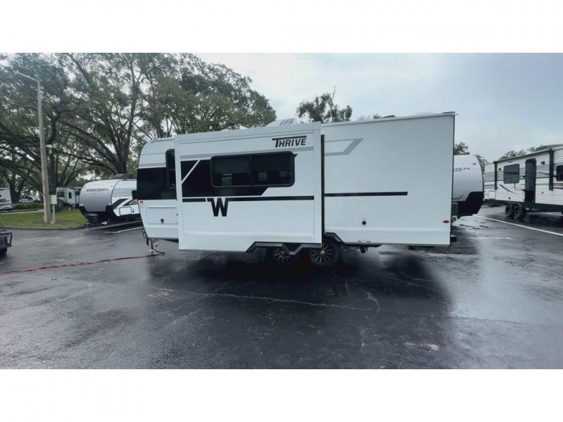 With any Thrive travel trailer by Winnebago, you can camp with functionality, comfort, and convenience! The large front viewing window with strike guard will be the first thing that catches your eye, and the fiberglass sidewalls with Azdel Onboard provide a durable trailer made to last. There is also an exterior ladder, along with front radius profile lights, power stabilizer jacks, and a powered awning with LED lighting to name a few exterior features. You will stay powered up by the 30-amp power cord and 200-watt solar panel, plus there is a tankless water heater for endless hot showers. Inside, you'll love the custom Winnebago furniture, carpetless side outs, molded fiberglass countertops, and residential recessed ceiling lights to keep your space well lit!