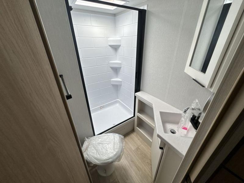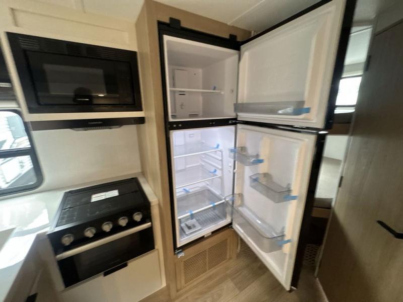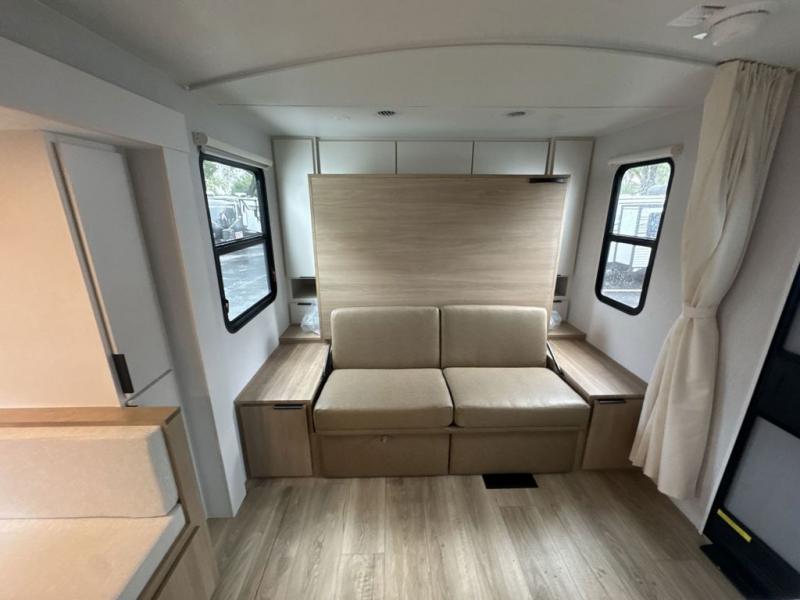If you enjoy camping with a larger group, this travel trailer with double-size bunks is sure to be a fit! There is also a U-shaped dinette within a slide for more sleeping space, and you'll find the front Olympic Queen Murphy bed to be very versatile. A recessed three burner cooktop with an oven will let you make meals each day, and the 10.6 cu. ft. 12V refrigerator will keep your cold items fresh. There is also a countertop extension, giving you more space to prep meals. The full bath includes a power vent fan and a shower skylight that will give you additional lighting and extra head room as you get ready each day!