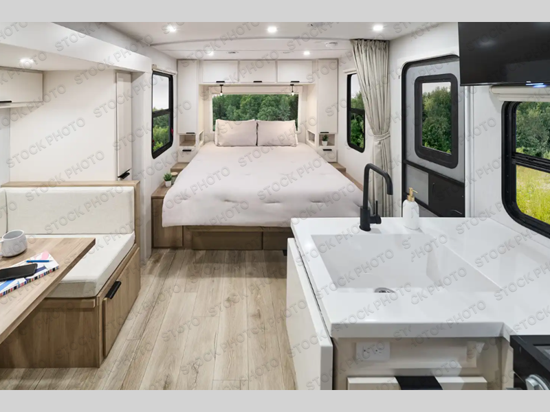 With any Thrive travel trailer by Winnebago, you can camp with functionality, comfort, and convenience! The large front viewing window with strike guard will be the first thing that catches your eye, and the fiberglass sidewalls with Azdel Onboard provide a durable trailer made to last. There is also an exterior ladder, along with front radius profile lights, power stabilizer jacks, and a powered awning with LED lighting to name a few exterior features. You will stay powered up by the 30-amp power cord and 200-watt solar panel, plus there is a tankless water heater for endless hot showers. Inside, you'll love the custom Winnebago furniture, carpetless side outs, molded fiberglass countertops, and residential recessed ceiling lights to keep your space well lit!