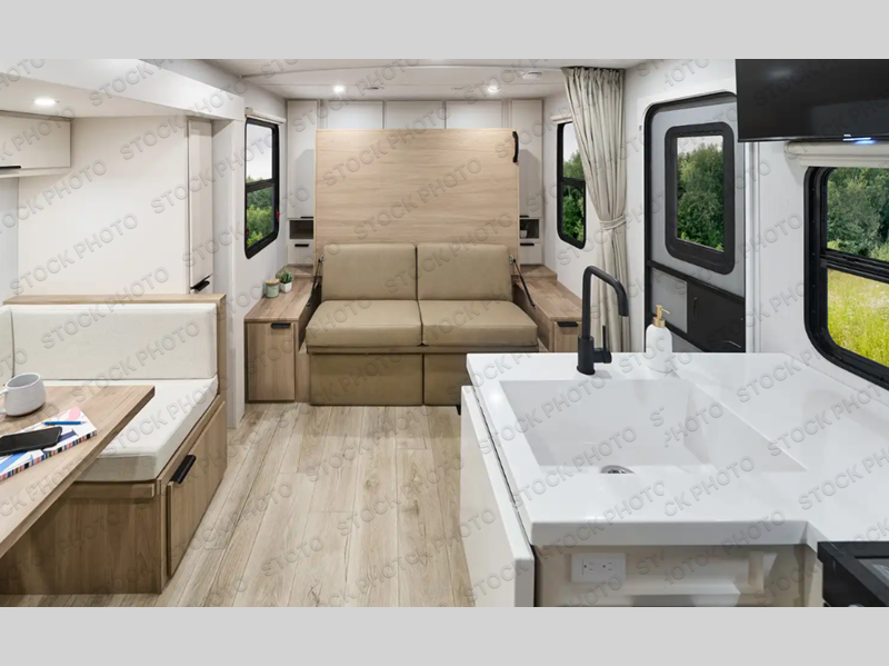 If you enjoy camping with a larger group, this travel trailer with double-size bunks is sure to be a fit! There is also a U-shaped dinette within a slide for more sleeping space, and you'll find the front Olympic Queen Murphy bed to be very versatile. A recessed three burner cooktop with an oven will let you make meals each day, and the 10.6 cu. ft. 12V refrigerator will keep your cold items fresh. There is also a countertop extension, giving you more space to prep meals. The full bath includes a power vent fan and a shower skylight that will give you additional lighting and extra head room as you get ready each day!