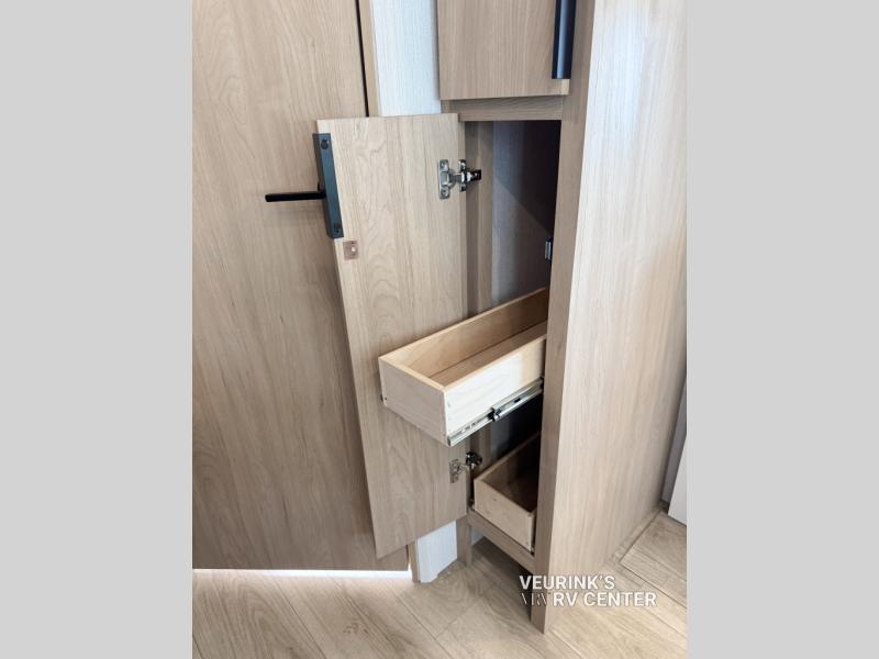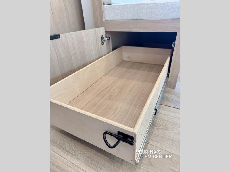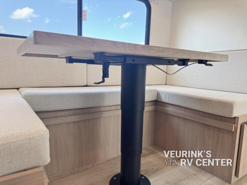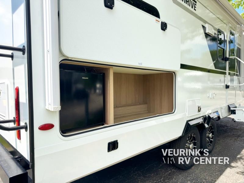 With any Thrive travel trailer by Winnebago, you can camp with functionality, comfort, and convenience! The large front viewing window with strike guard will be the first thing that catches your eye, and the fiberglass sidewalls with Azdel Onboard provide a durable trailer made to last. There is also an exterior ladder, along with front radius profile lights, power stabilizer jacks, and a powered awning with LED lighting to name a few exterior features. You will stay powered up by the 30-amp power cord and 200-watt solar panel, plus there is a tankless water heater for endless hot showers. Inside, you'll love the custom Winnebago furniture, carpetless side outs, molded fiberglass countertops, and residential recessed ceiling lights to keep your space well lit!