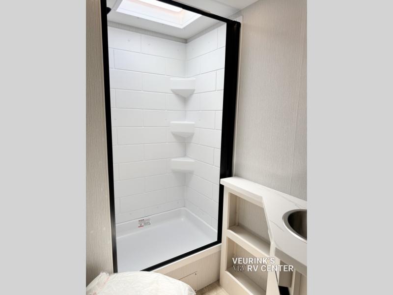 If you enjoy camping with a larger group, this travel trailer with double-size bunks is sure to be a fit! There is also a U-shaped dinette within a slide for more sleeping space, and you'll find the front Olympic Queen Murphy bed to be very versatile. A recessed three burner cooktop with an oven will let you make meals each day, and the 10.6 cu. ft. 12V refrigerator will keep your cold items fresh. There is also a countertop extension, giving you more space to prep meals. The full bath includes a power vent fan and a shower skylight that will give you additional lighting and extra head room as you get ready each day!