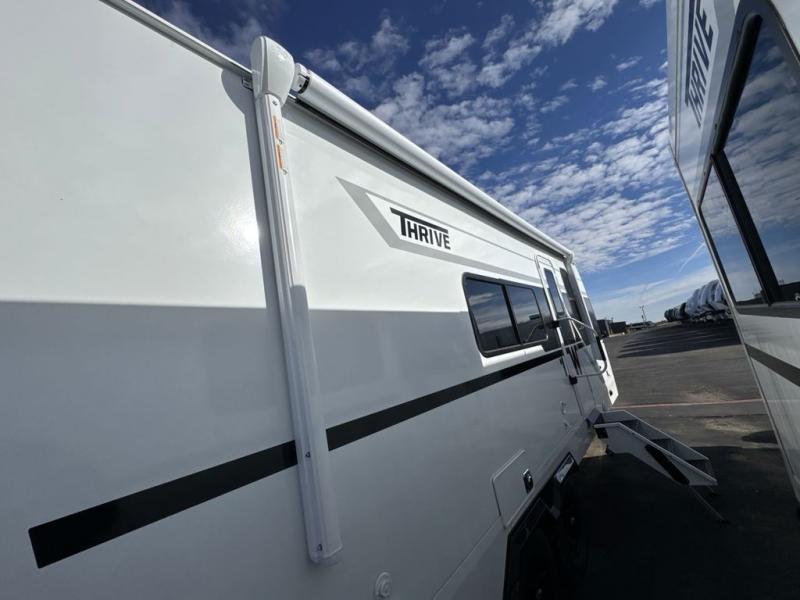 With any Thrive travel trailer by Winnebago, you can camp with functionality, comfort, and convenience! The large front viewing window with strike guard will be the first thing that catches your eye, and the fiberglass sidewalls with Azdel Onboard provide a durable trailer made to last. There is also an exterior ladder, along with front radius profile lights, power stabilizer jacks, and a powered awning with LED lighting to name a few exterior features. You will stay powered up by the 30-amp power cord and 200-watt solar panel, plus there is a tankless water heater for endless hot showers. Inside, you'll love the custom Winnebago furniture, carpetless side outs, molded fiberglass countertops, and residential recessed ceiling lights to keep your space well lit!