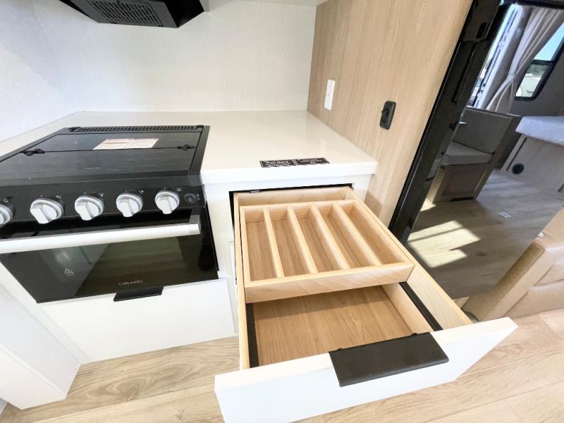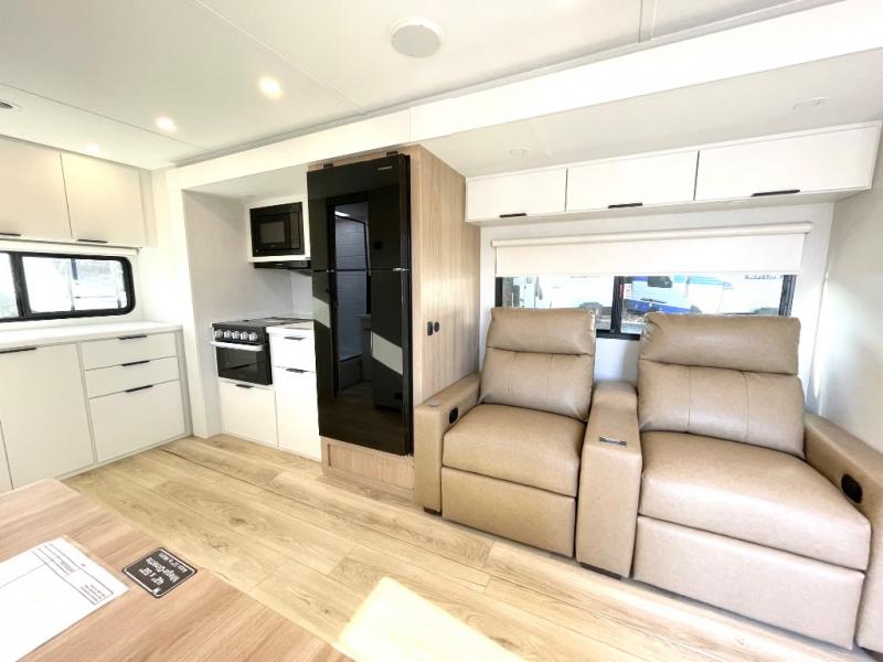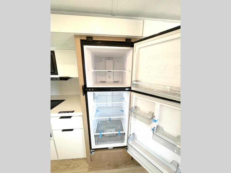 Have everything you need in a compact and well-equipped travel trailer. In the main area there is a large 42" x 82" U-shaped dinette with plenty of room to enjoy a meal, games or sharing stories. Across there is theater seating located in the slide-out that adds extra comfort and seating space. You can enjoy cooking every day from a quick pancake to your favorite casserole in the cooktop with oven and store leftovers in the 10.6 cu. ft. refrigerator. Moving forward you'll find convenient storage options such as the pantry with removable shelves. In the front you'll find a spacious 66" x 80" Olympic queen bed, on each side wardrobes for more storage.