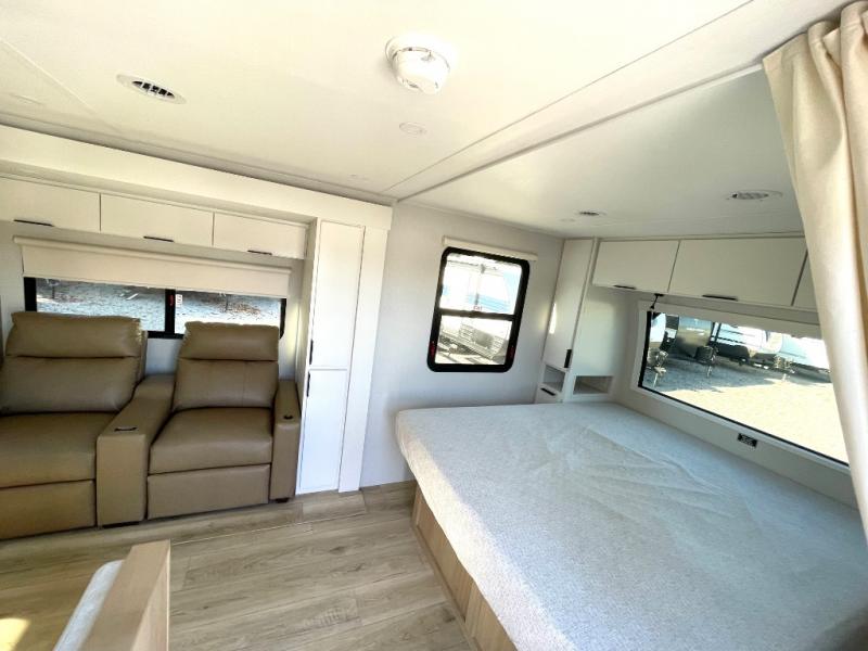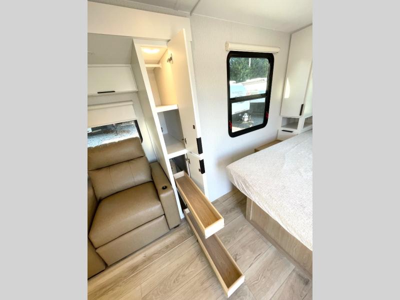With any Thrive travel trailer by Winnebago, you can camp with functionality, comfort, and convenience! The large front viewing window with strike guard will be the first thing that catches your eye, and the fiberglass sidewalls with Azdel Onboard provide a durable trailer made to last. There is also an exterior ladder, along with front radius profile lights, power stabilizer jacks, and a powered awning with LED lighting to name a few exterior features. You will stay powered up by the 30-amp power cord and 200-watt solar panel, plus there is a tankless water heater for endless hot showers. Inside, you'll love the custom Winnebago furniture, carpetless side outs, molded fiberglass countertops, and residential recessed ceiling lights to keep your space well lit!