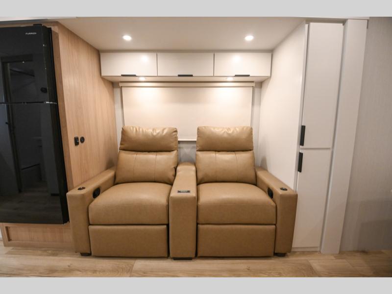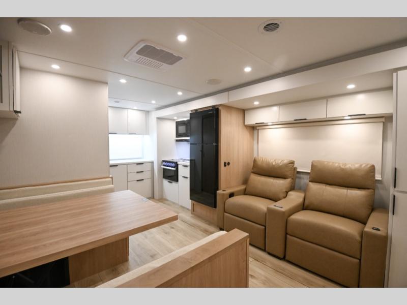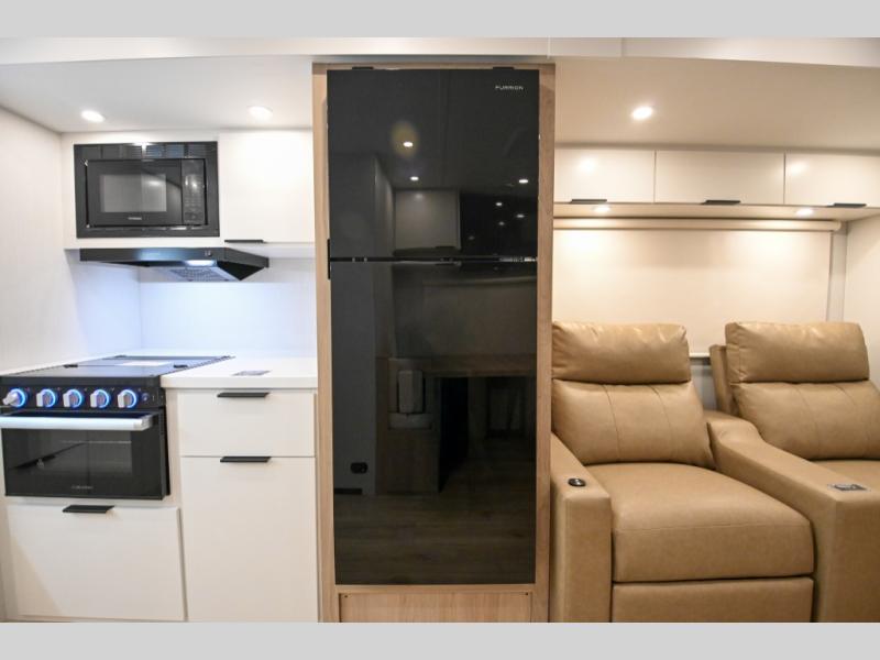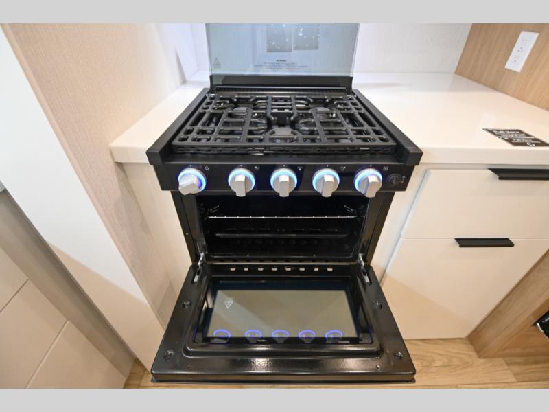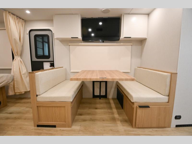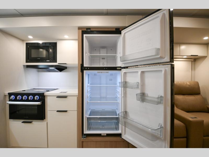 Have everything you need in a compact and well-equipped travel trailer. In the main area there is a large 42" x 82" U-shaped dinette with plenty of room to enjoy a meal, games or sharing stories. Across there is theater seating located in the slide-out that adds extra comfort and seating space. You can enjoy cooking every day from a quick pancake to your favorite casserole in the cooktop with oven and store leftovers in the 10.6 cu. ft. refrigerator. Moving forward you'll find convenient storage options such as the pantry with removable shelves. In the front you'll find a spacious 66" x 80" Olympic queen bed, on each side wardrobes for more storage.