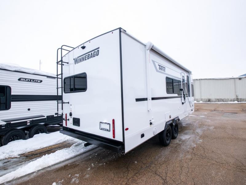 With any Thrive travel trailer by Winnebago, you can camp with functionality, comfort, and convenience! The large front viewing window with strike guard will be the first thing that catches your eye, and the fiberglass sidewalls with Azdel Onboard provide a durable trailer made to last. There is also an exterior ladder, along with front radius profile lights, power stabilizer jacks, and a powered awning with LED lighting to name a few exterior features. You will stay powered up by the 30-amp power cord and 200-watt solar panel, plus there is a tankless water heater for endless hot showers. Inside, you'll love the custom Winnebago furniture, carpetless side outs, molded fiberglass countertops, and residential recessed ceiling lights to keep your space well lit!