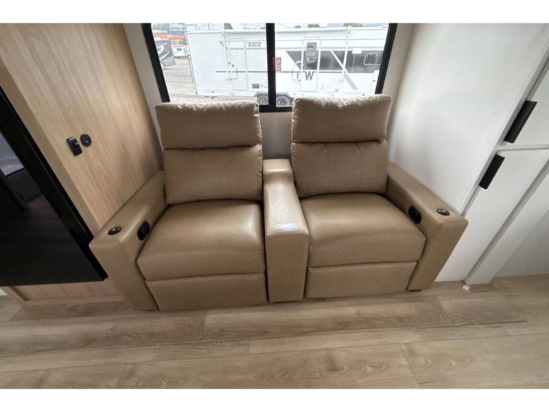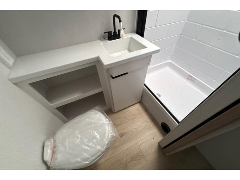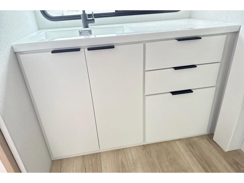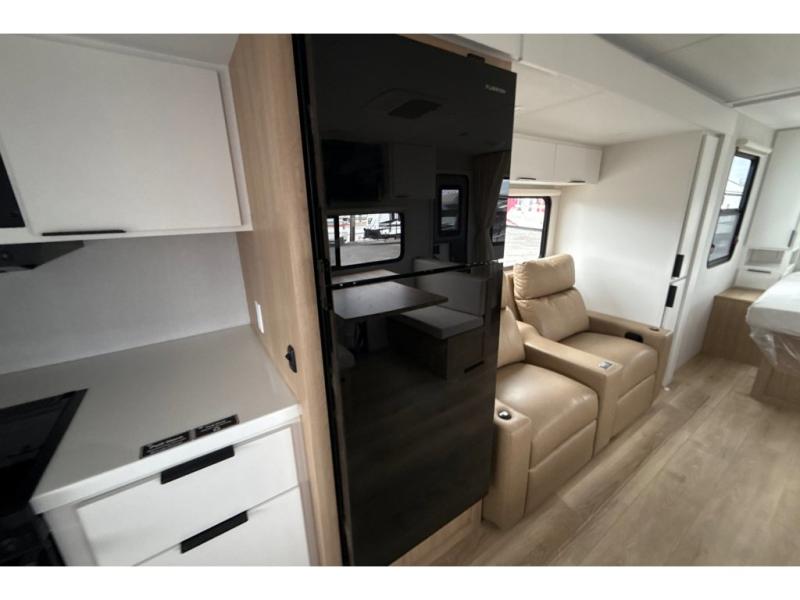 Have everything you need in a compact and well-equipped travel trailer. In the main area there is a large 42" x 82" U-shaped dinette with plenty of room to enjoy a meal, games or sharing stories. Across there is theater seating located in the slide-out that adds extra comfort and seating space. You can enjoy cooking every day from a quick pancake to your favorite casserole in the cooktop with oven and store leftovers in the 10.6 cu. ft. refrigerator. Moving forward you'll find convenient storage options such as the pantry with removable shelves. In the front you'll find a spacious 66" x 80" Olympic queen bed, on each side wardrobes for more storage.