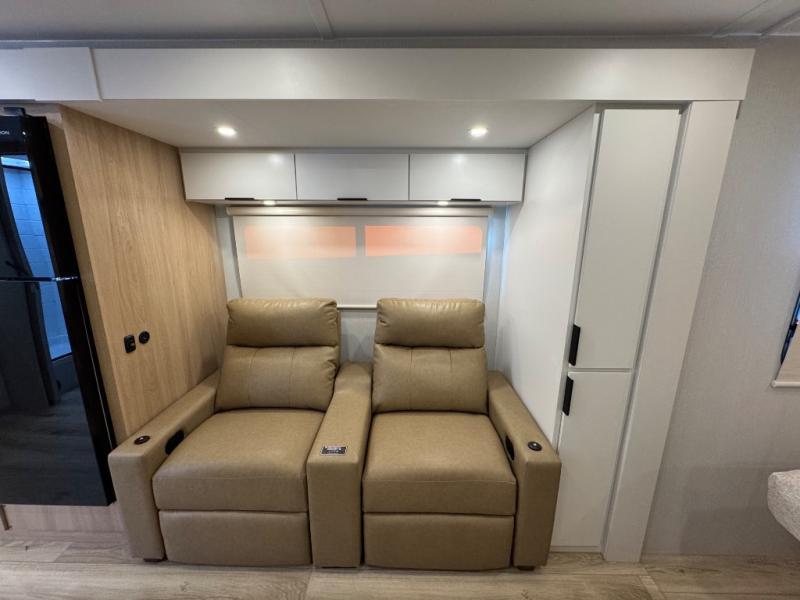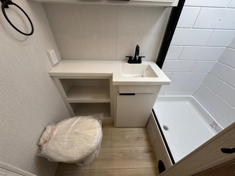 Have everything you need in a compact and well-equipped travel trailer. In the main area there is a large 42" x 82" U-shaped dinette with plenty of room to enjoy a meal, games or sharing stories. Across there is theater seating located in the slide-out that adds extra comfort and seating space. You can enjoy cooking every day from a quick pancake to your favorite casserole in the cooktop with oven and store leftovers in the 10.6 cu. ft. refrigerator. Moving forward you'll find convenient storage options such as the pantry with removable shelves. In the front you'll find a spacious 66" x 80" Olympic queen bed, on each side wardrobes for more storage.