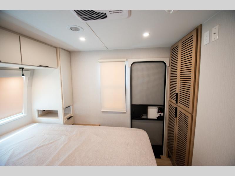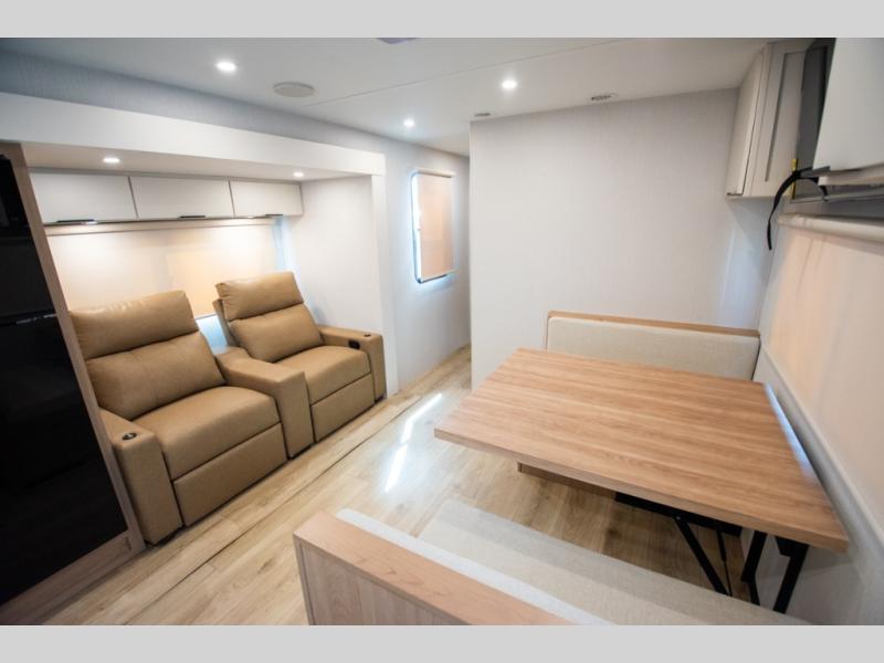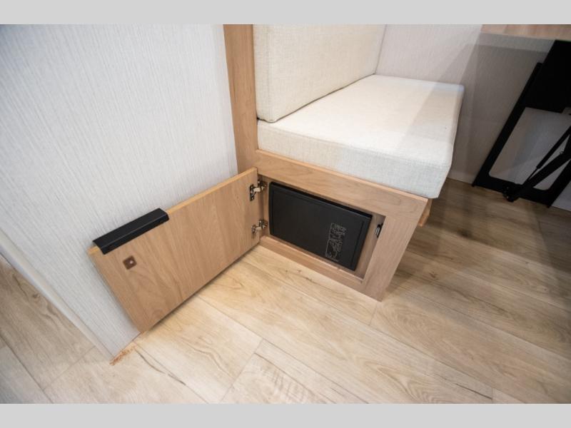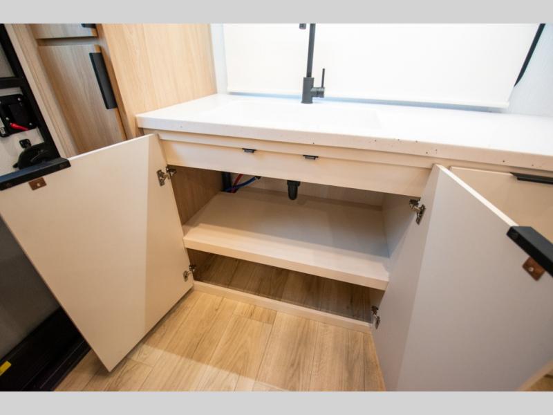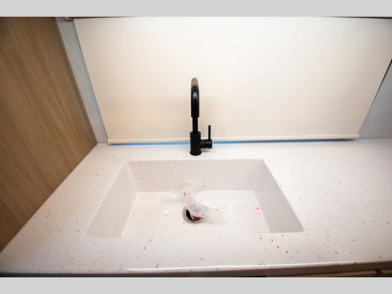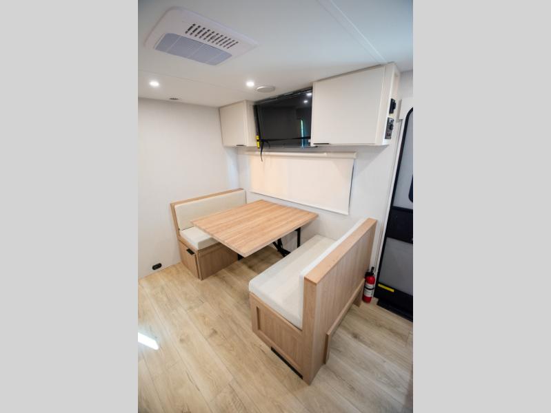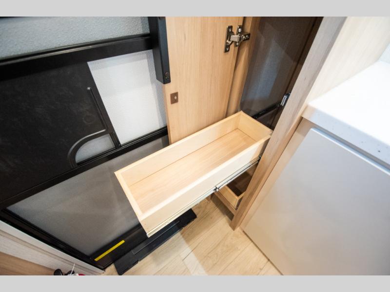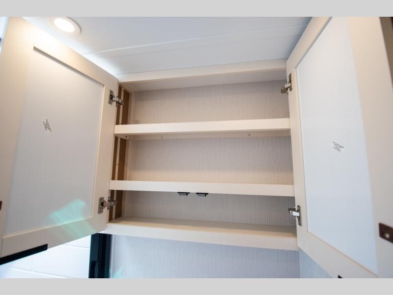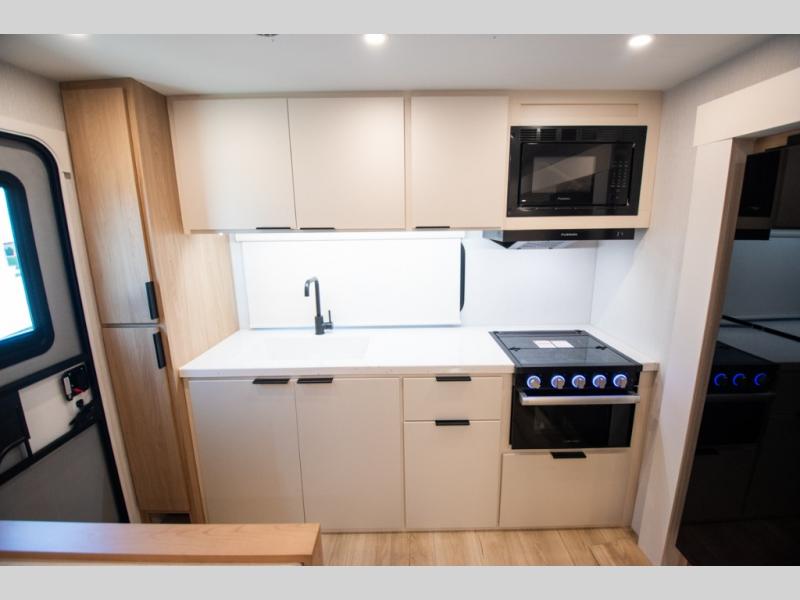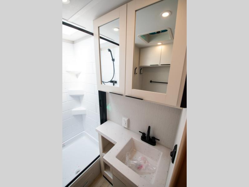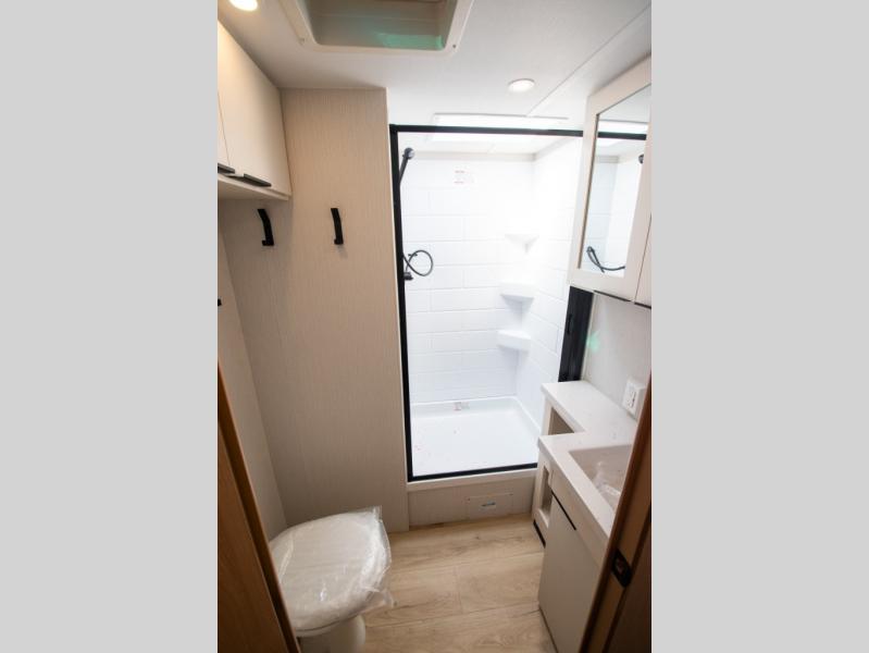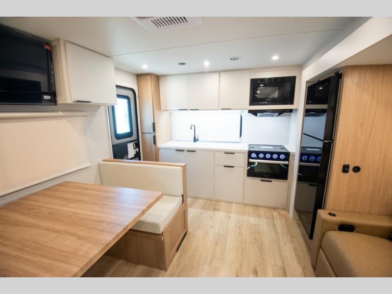 The Thrive 24RKS offers smart design and comfort with dual entry doors for easy access. The spacious rear galley features a pull-out pantry, integrated waste and recycling bins, and generous counter space for effortless meal prep. Enjoy extra room in the MegaDinette, which adds 10 inches of seating—perfect for dining, working, or relaxing. The private front bedroom includes an Olympic queen-size bed, a full closet with washer/dryer prep, and a large panoramic window for natural light. The 24RKS is built for travelers who don't want to compromise on home-like features on the road.