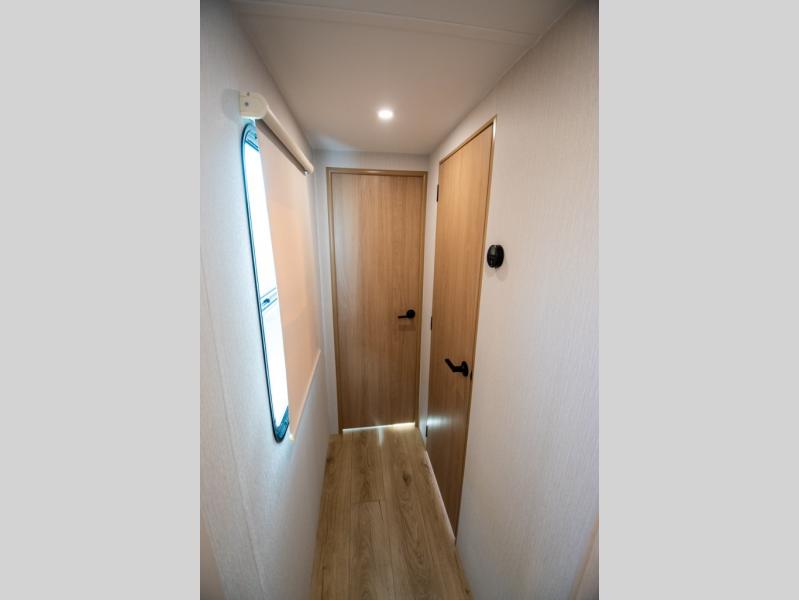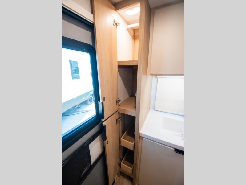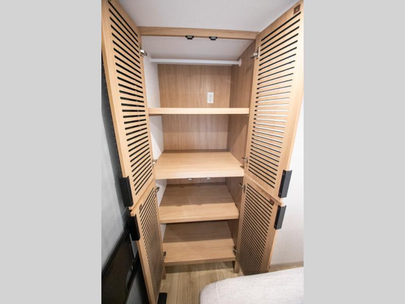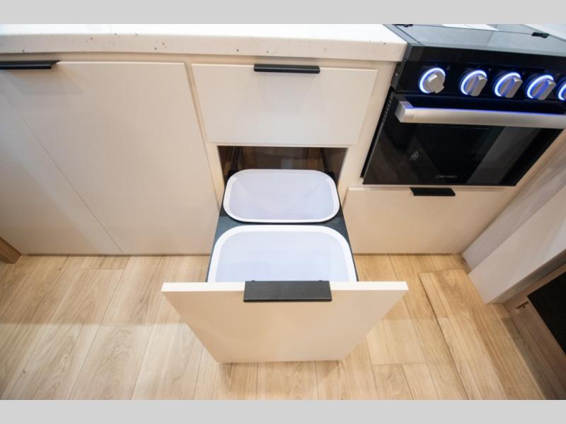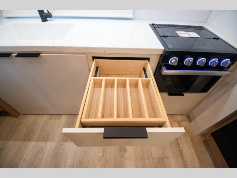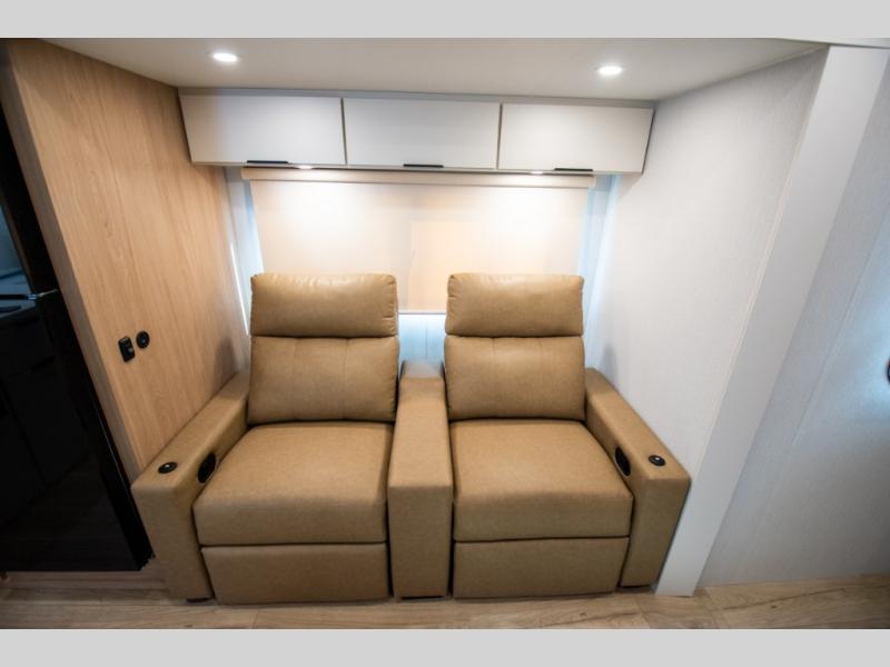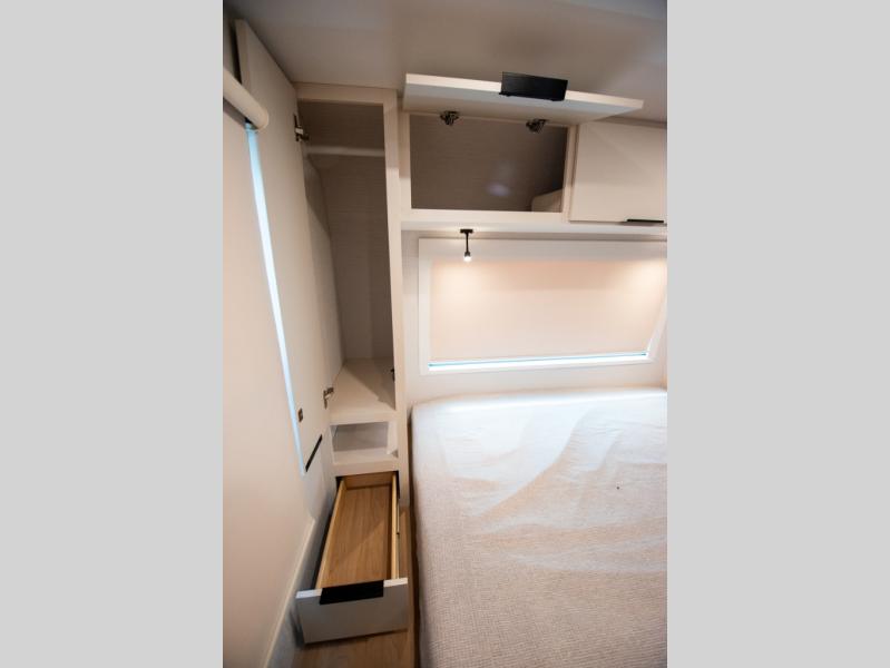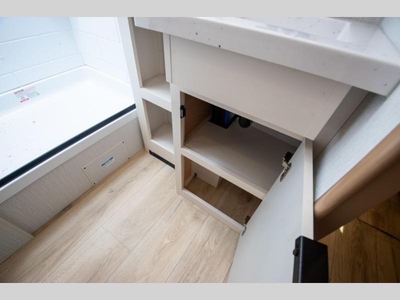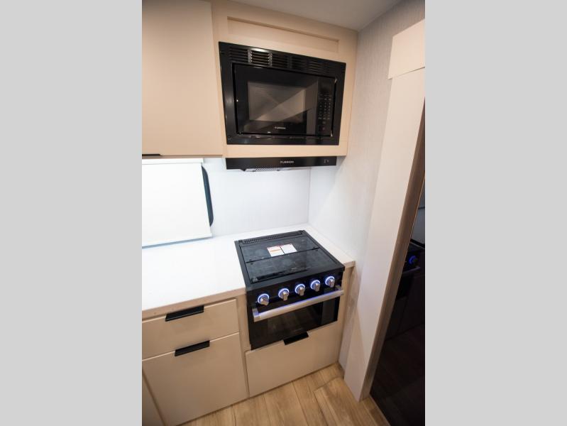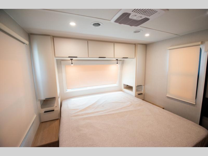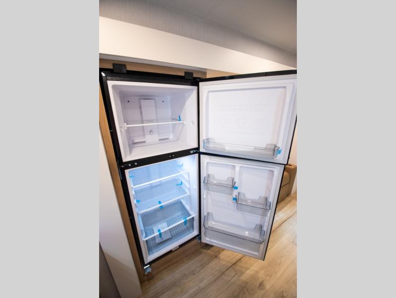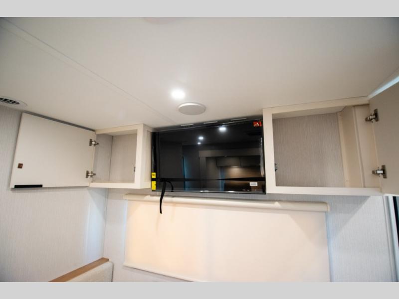 The Thrive 24RKS offers smart design and comfort with dual entry doors for easy access. The spacious rear galley features a pull-out pantry, integrated waste and recycling bins, and generous counter space for effortless meal prep. Enjoy extra room in the MegaDinette, which adds 10 inches of seating—perfect for dining, working, or relaxing. The private front bedroom includes an Olympic queen-size bed, a full closet with washer/dryer prep, and a large panoramic window for natural light. The 24RKS is built for travelers who don't want to compromise on home-like features on the road.