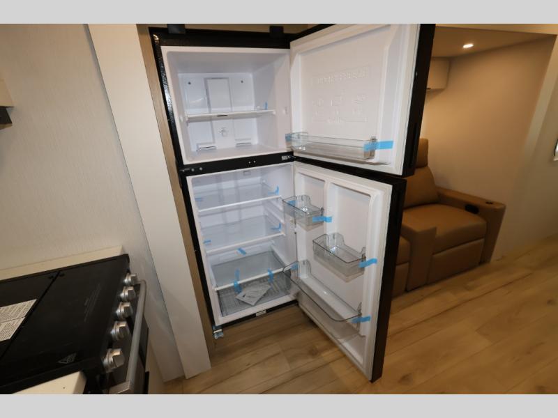 This travel trailer provides both comfort and convenience. At the front, you'll find a private bedroom with its own exterior entry for added privacy and ease of access. The middle bathroom ensures convenient access from all areas and includes a wardrobe with washer and dryer prep. In the main living space, a spacious 42" x 82" Mega Dinette provides a great spot for meals, games, or work, while theater seating across from the TV allows for relaxing evenings. At the rear, the fully equipped kitchen includes a cooktop with oven, a refrigerator, and a pantry with pull-out shelves for maximum storage and organization. A second exterior exit from the kitchen area adds extra convenience, providing both a comfortable and functional trailer.